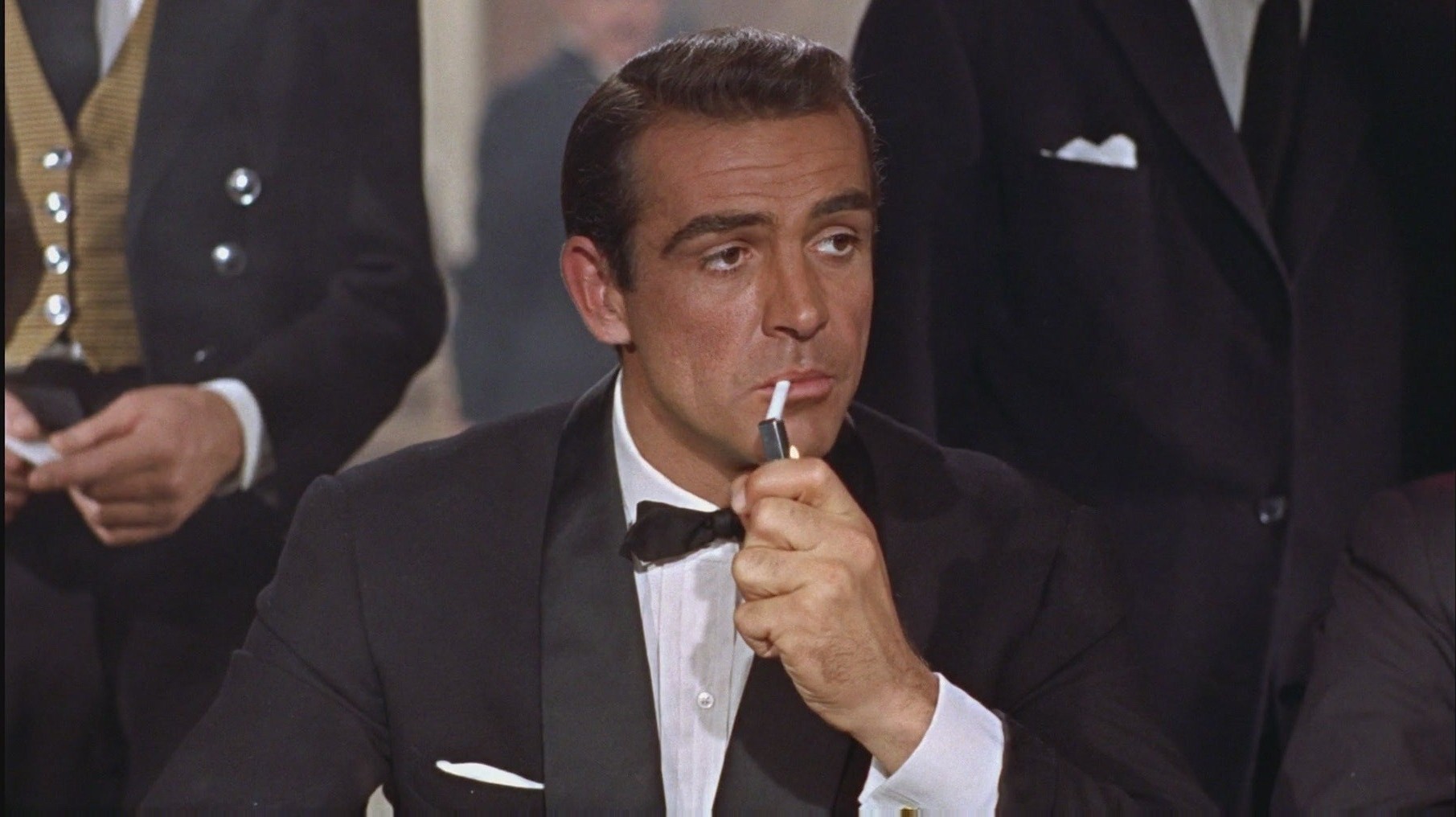 Description: A man in a tuxedo smoking a cigarette in a suit and tie with other men in suits.