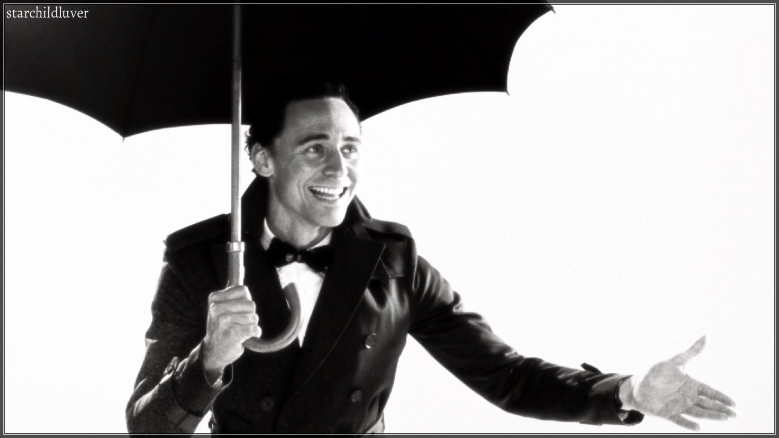 Description: A man in a tuxedo holding an umbrella in the air and smiling at the camera with his hands out.