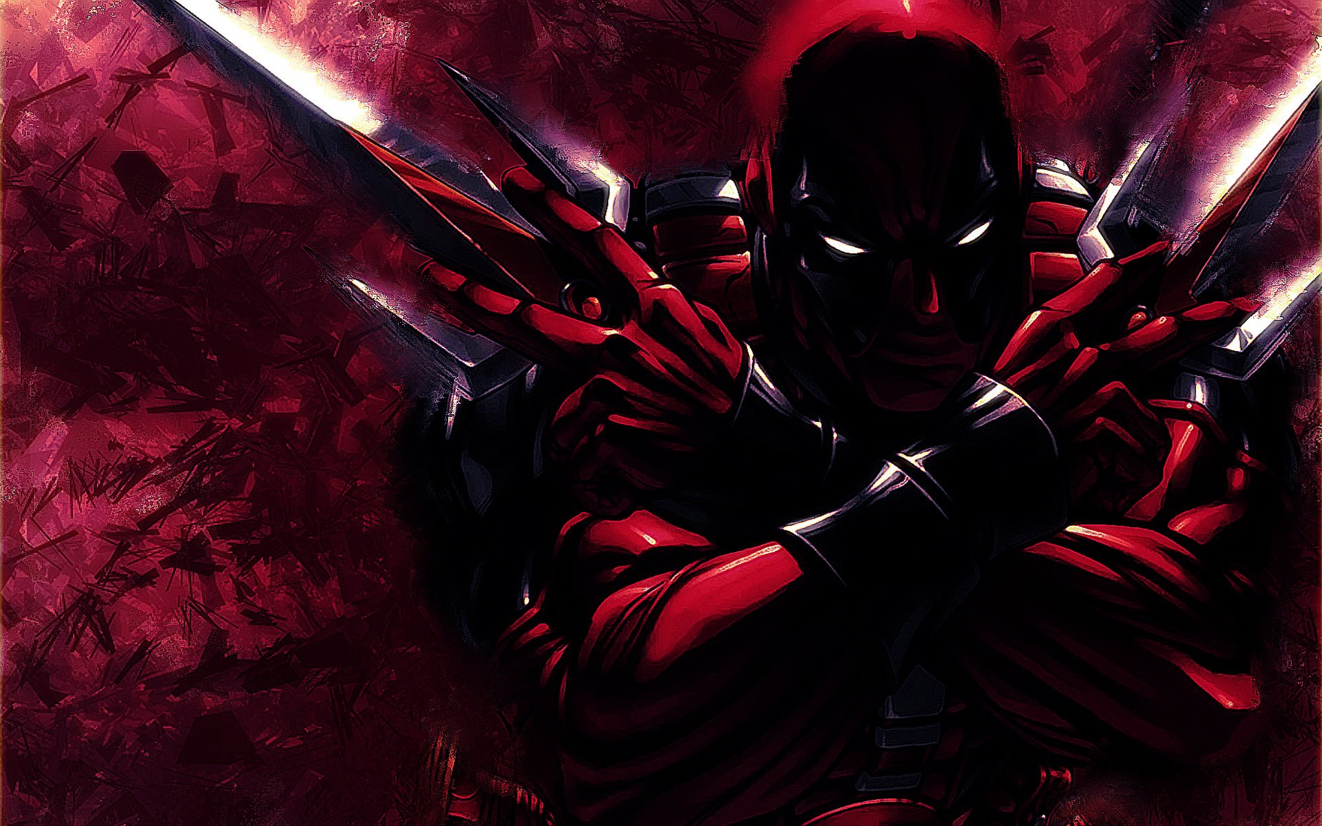 Description: A man with two swords in his hands and a red background with a red light behind him and a red background with a red light.