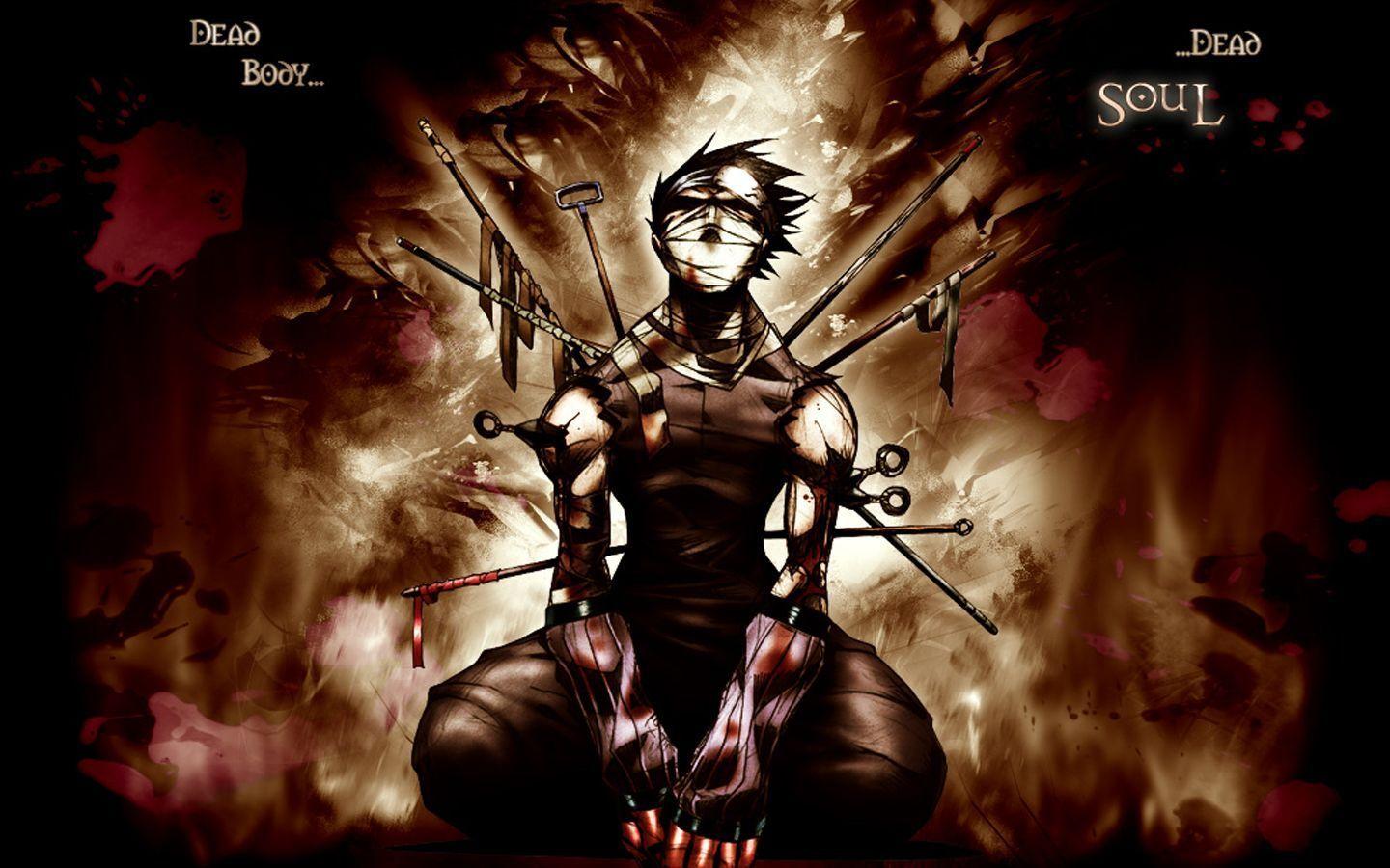 Description: A man with two swords in his hands sitting on a chair in front of a fire and flames background.