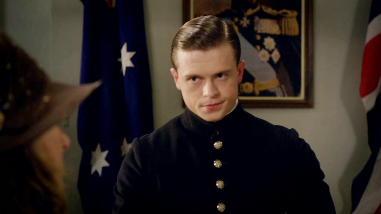 Description: A man in a uniform standing in front of a flag and a woman in a hat looking at him.