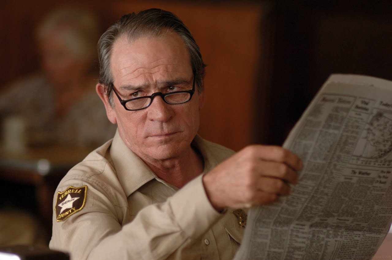 Description: A man in a uniform reading a newspaper while sitting at a table with a woman in the background looking at the newspaper.