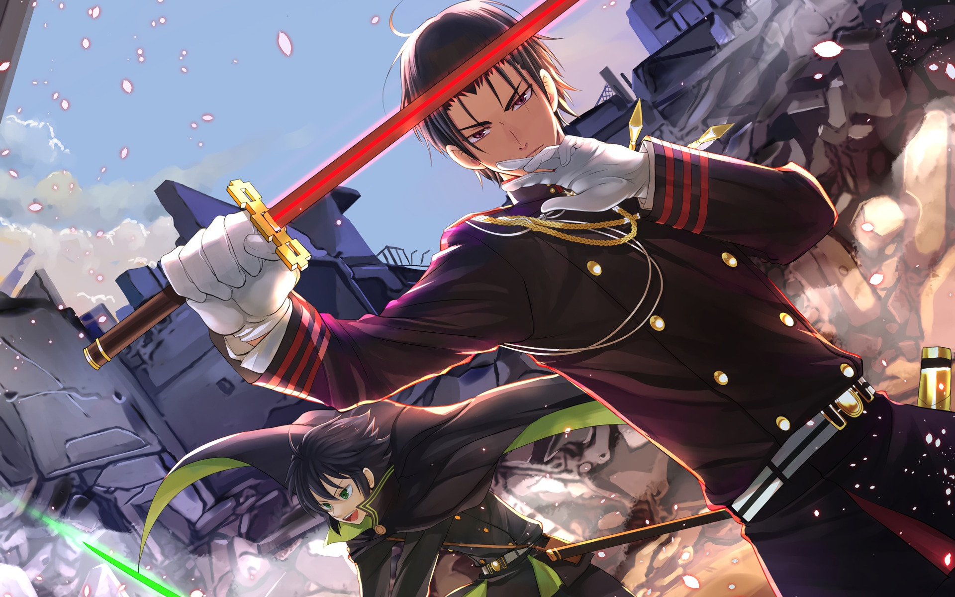 Description: A man in uniform holding a sword in front of a building with a sky background and snow falling on the ground.