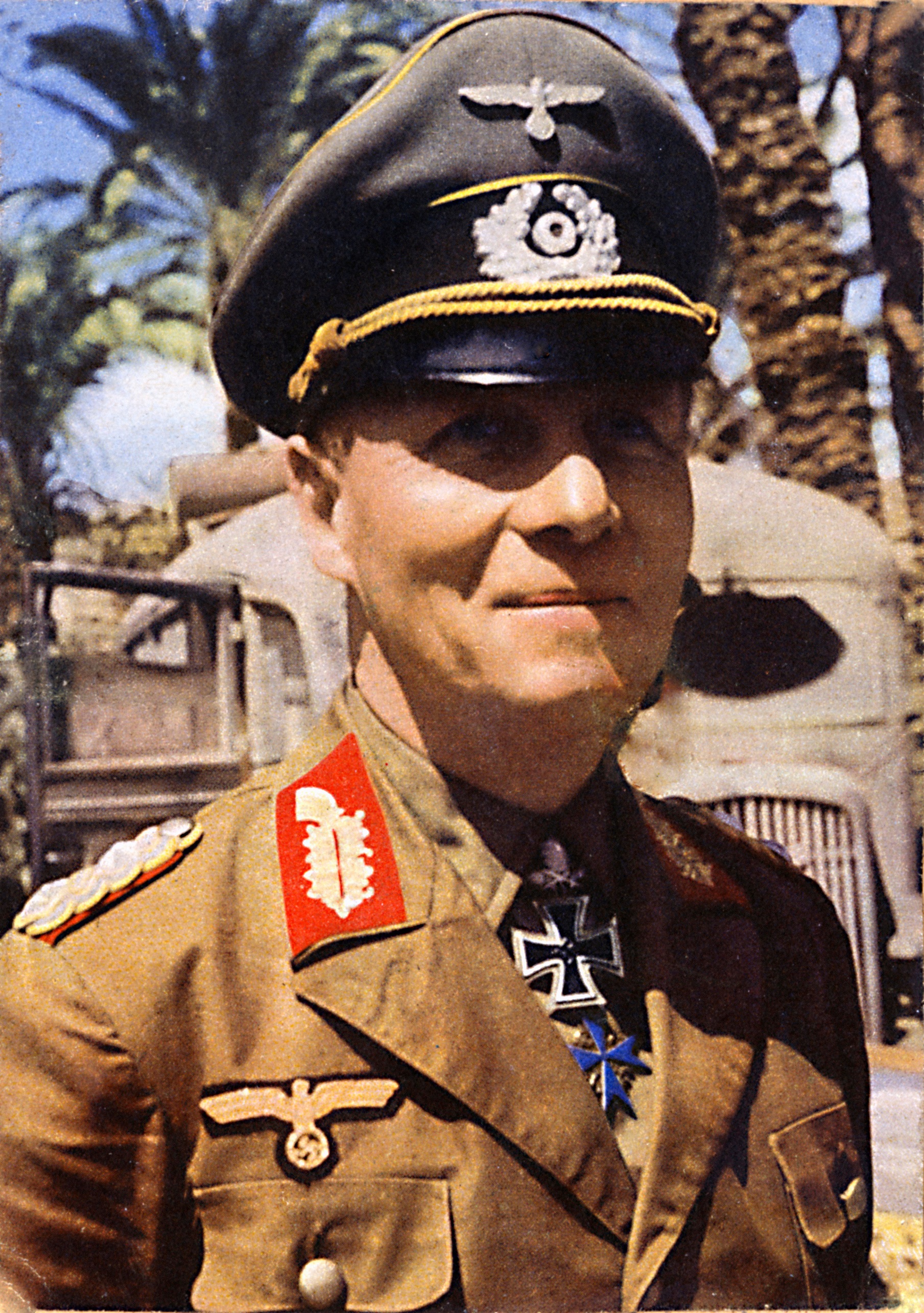 Description: A man in a uniform standing in front of a truck and palm trees in the background.