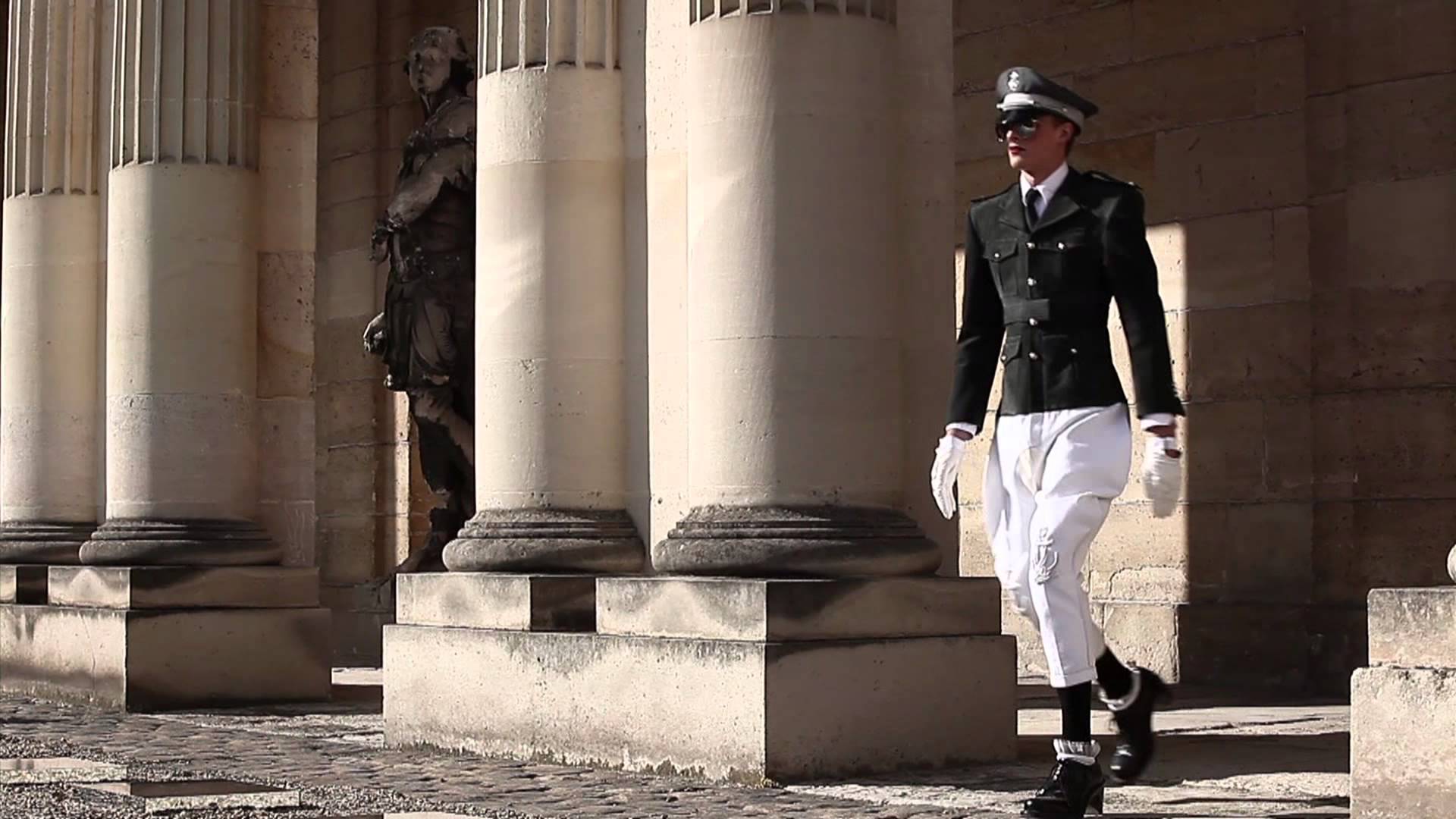 Description: A man in a uniform walking down a street next to columns and pillars with columns on either side of him.