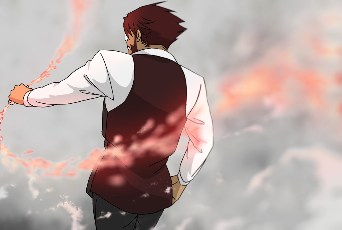 Description: A man in a vest and tie standing in front of a cloudy sky with a red and white swirl.