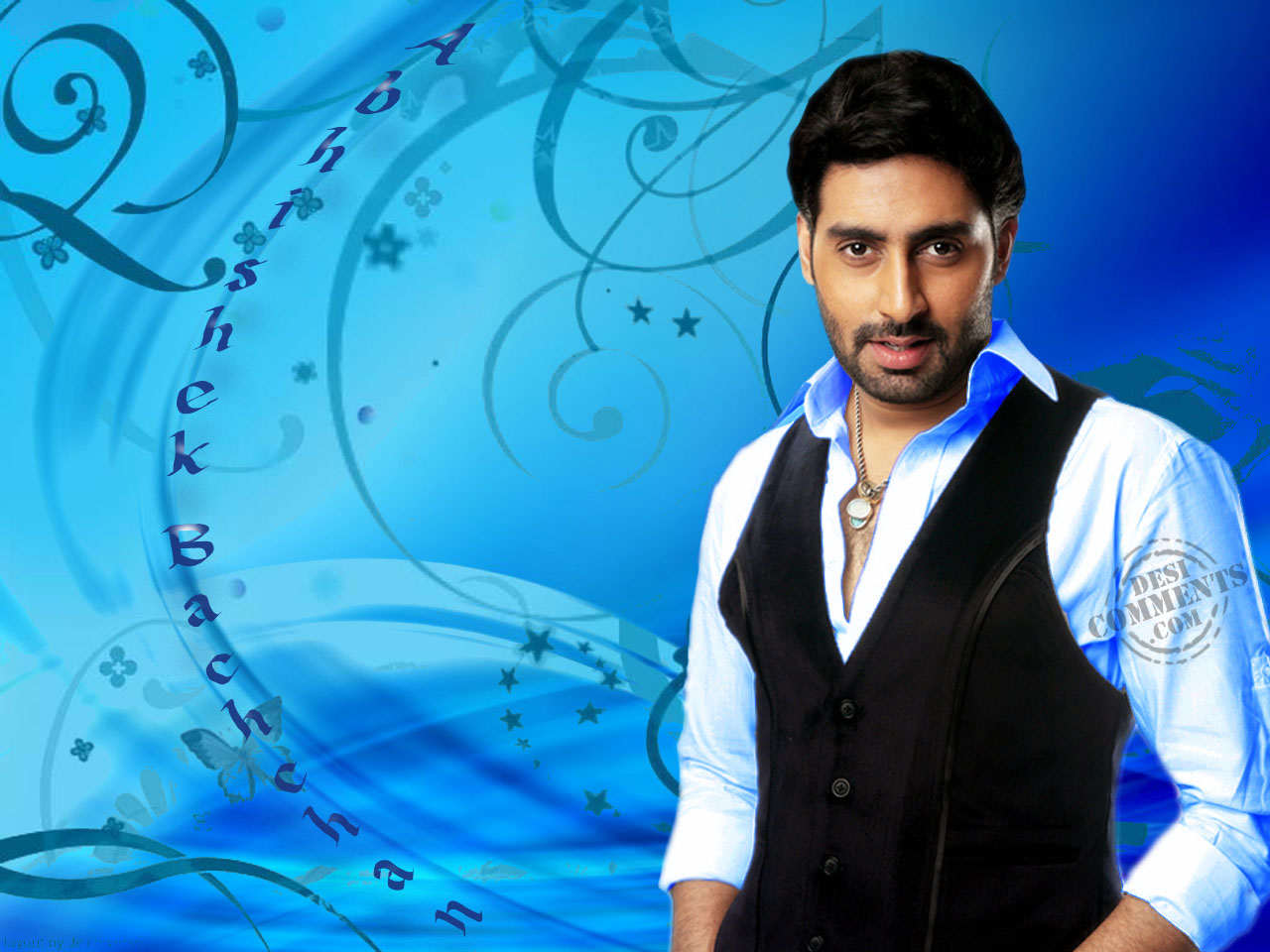 Description: A man in a vest and white shirt standing in front of a blue background with swirls and stars.