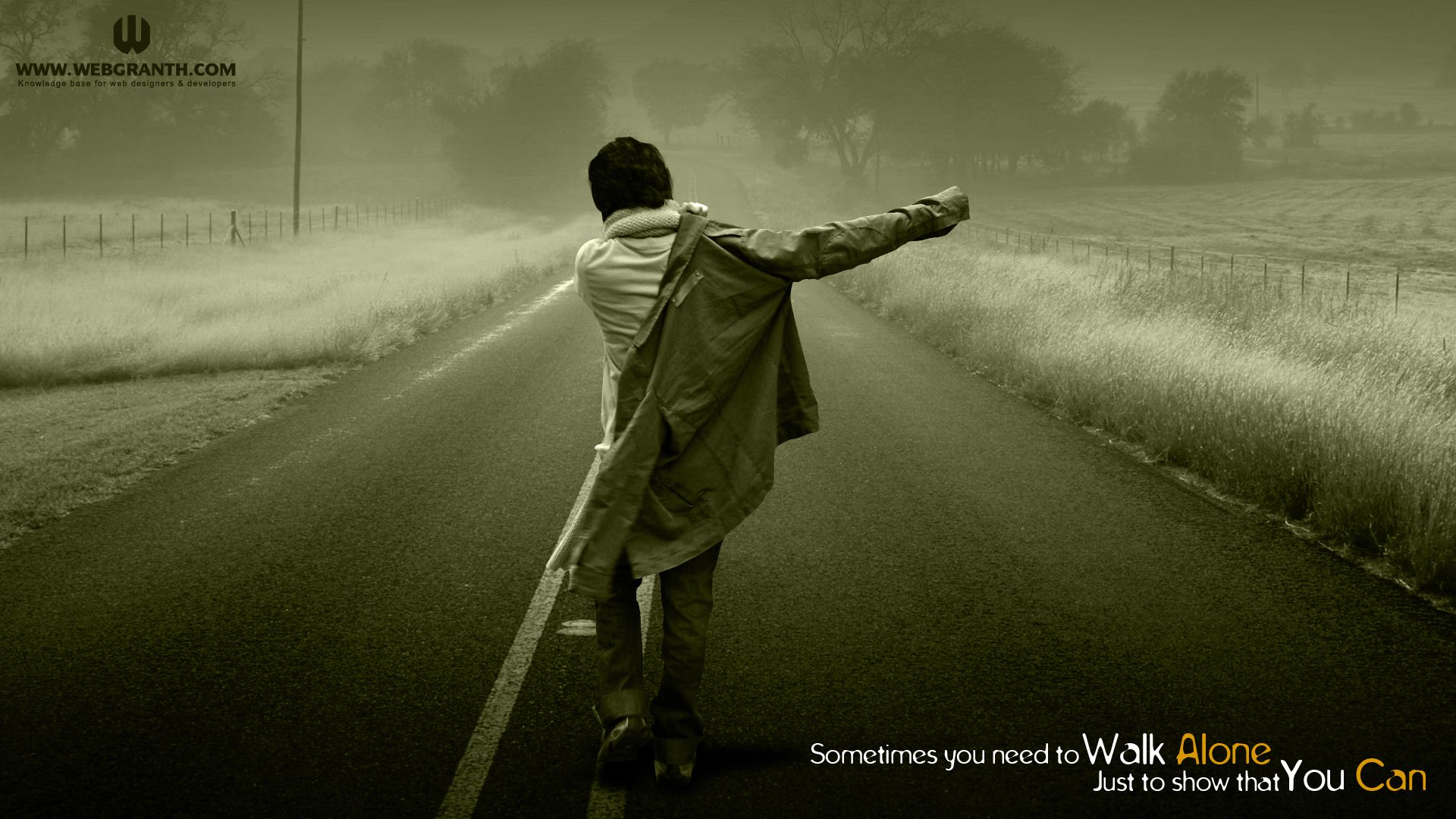 Description: A man walking down a road with his arms outstretched in the air and a foggy field behind him.