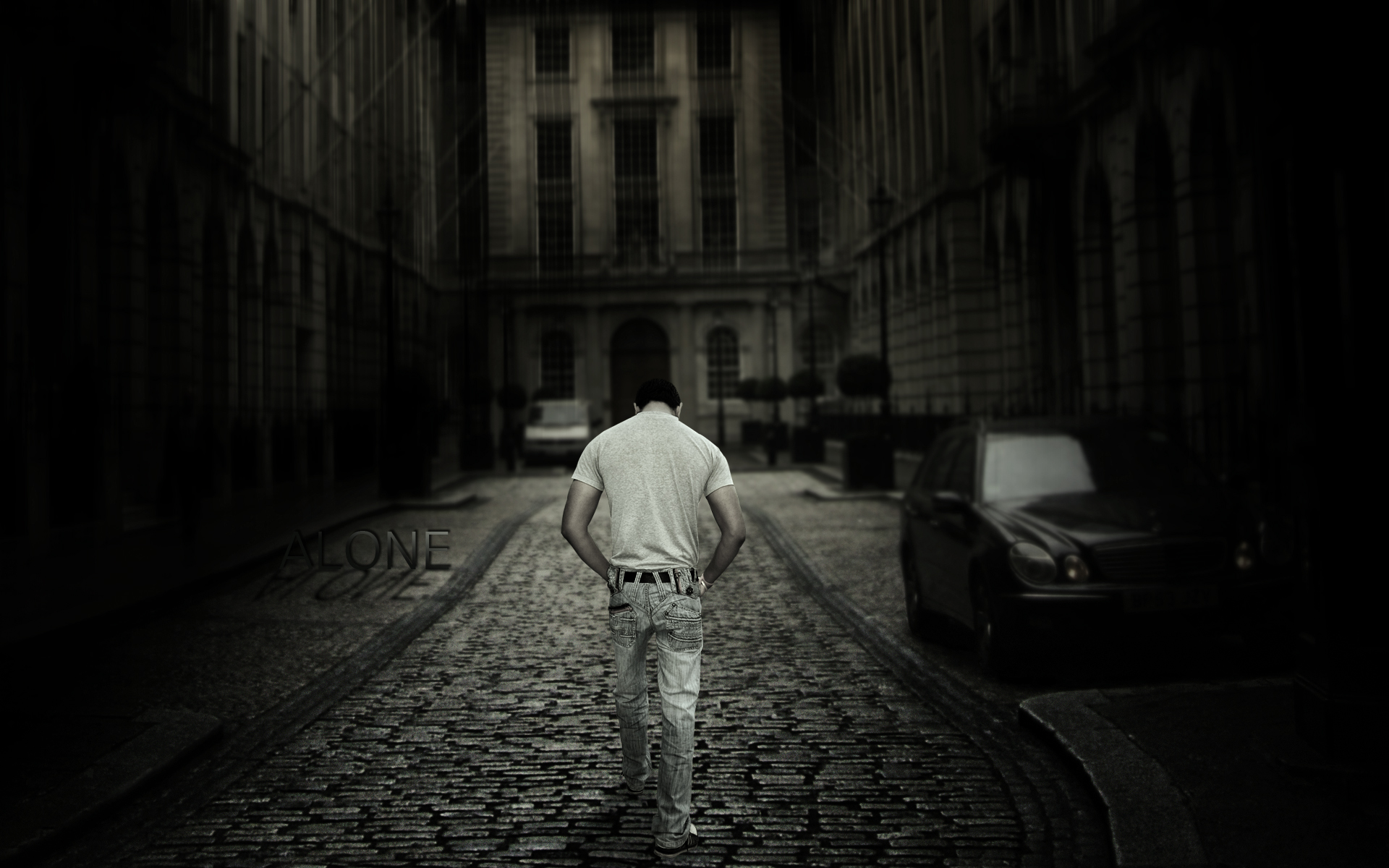 Description: A man walking down a cobblestone street in a city at night with a car parked on the side of the street.