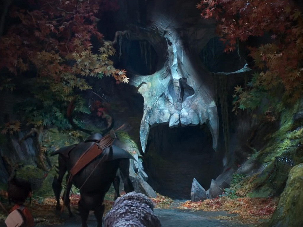 Description: A man is walking towards a giant skull in a forest with a horse and a boy looking at it.