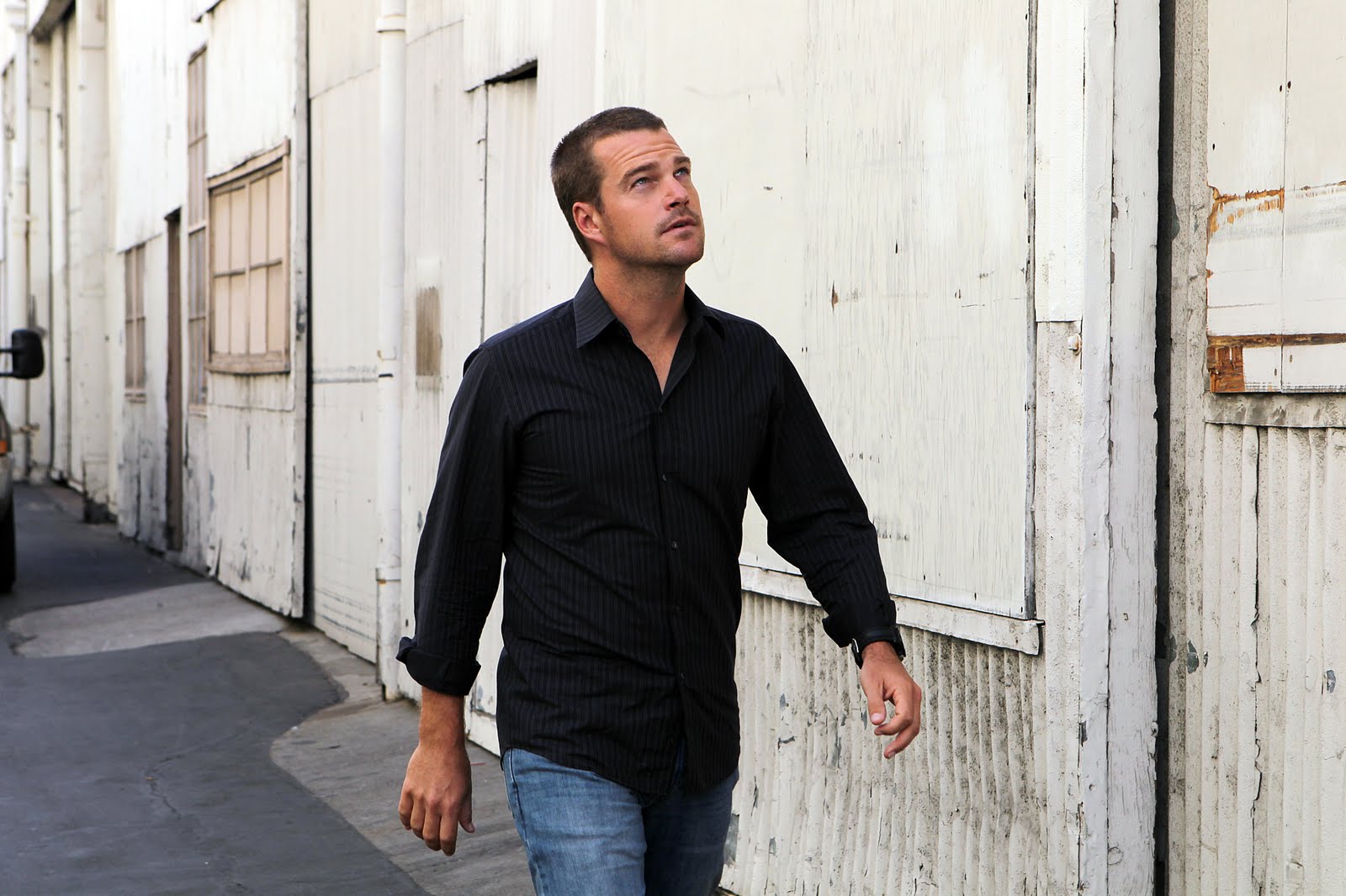 Description: A man walking down a street next to a building with a black shirt on and a black tie on.