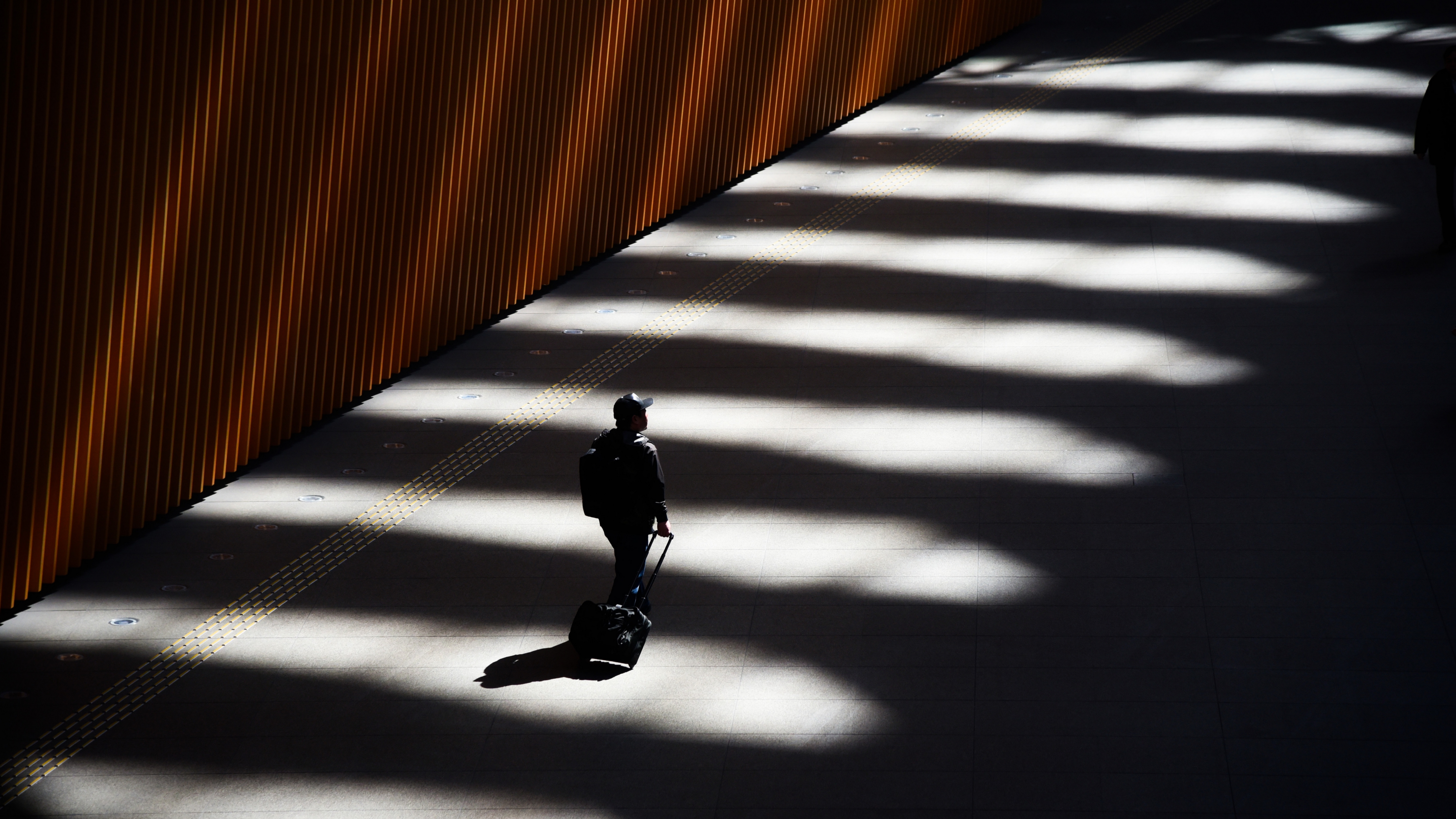 Description: A man walking down a sidewalk with a suitcase in his hand and a shadow on the ground behind him.