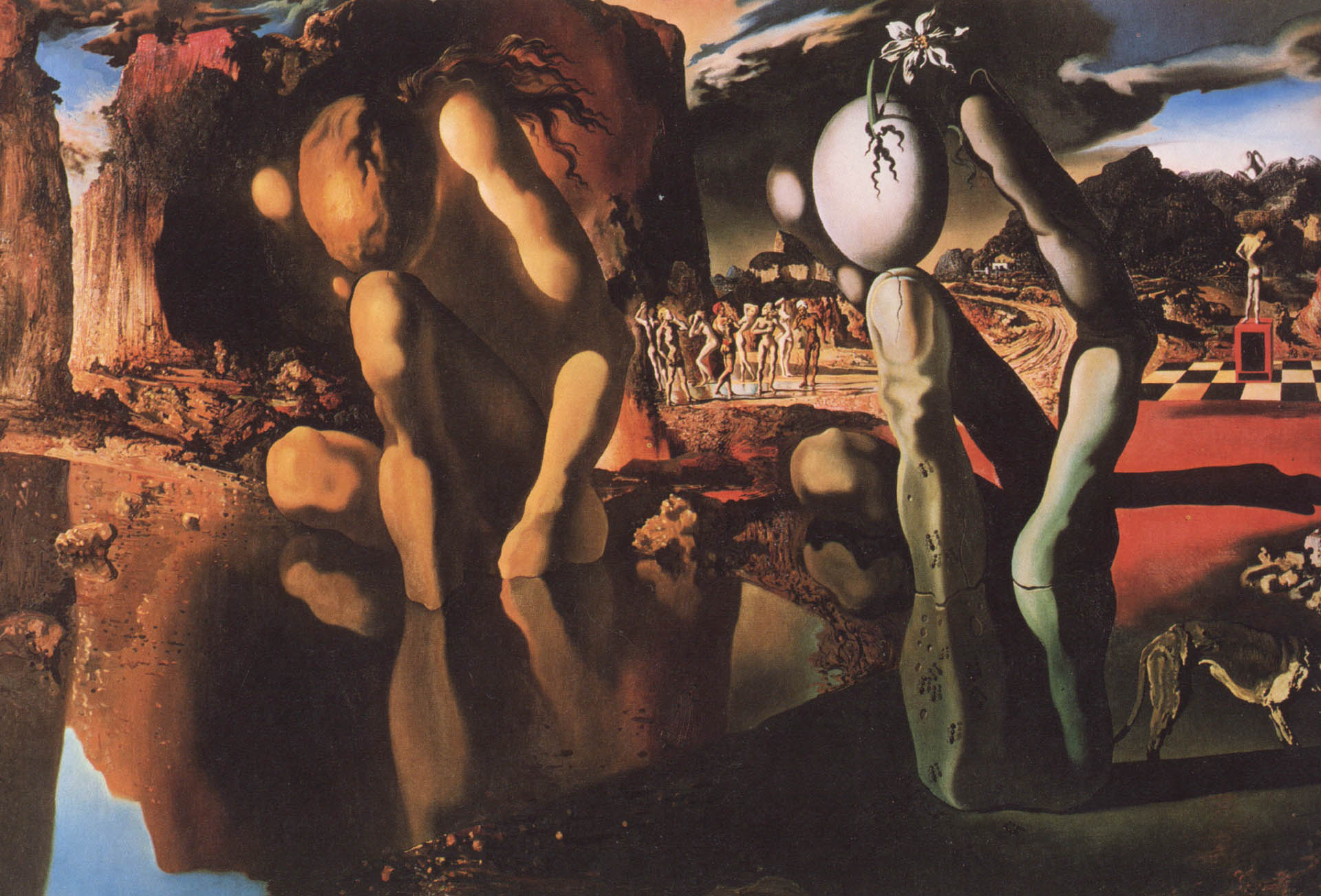 Description: A painting of a man standing in front of a body of water and a mountain with a sky background.