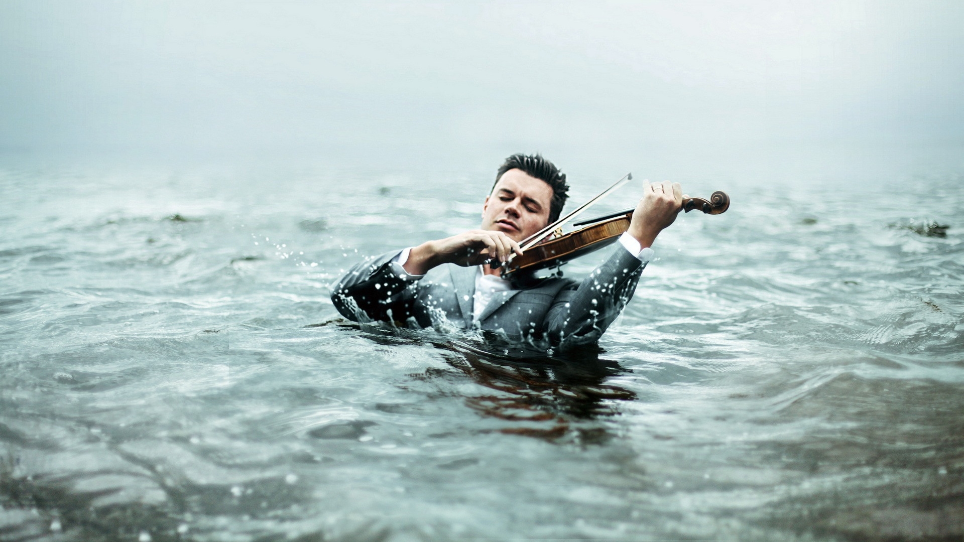 Description: A man in a wet suit playing a violin in the water on a cloudy day with a grey sky.