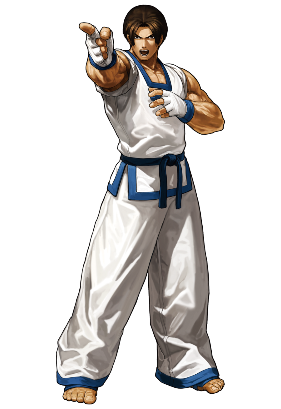 Description: A man in a white and blue outfit pointing at something with his hand in the air and his right hand out.