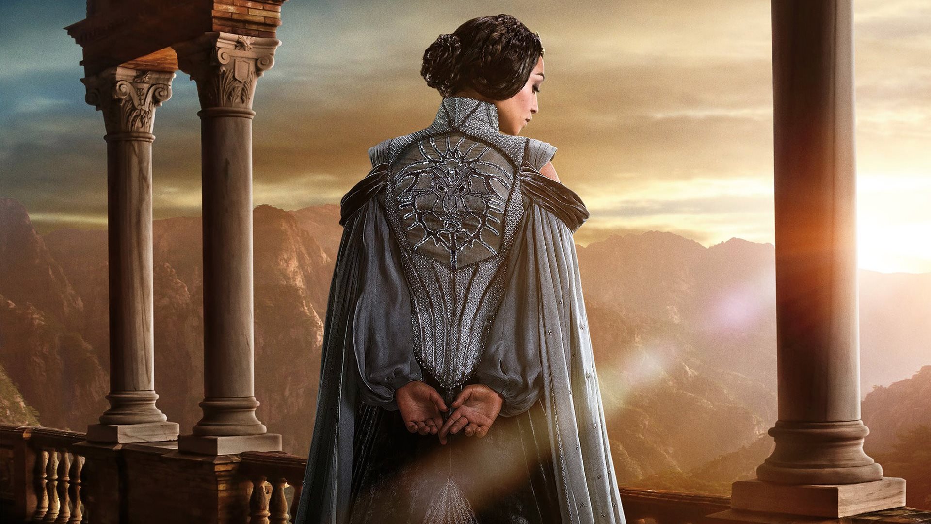 Description: A man in a white cape and a white dress standing on a balcony with pillars and pillars in the background.