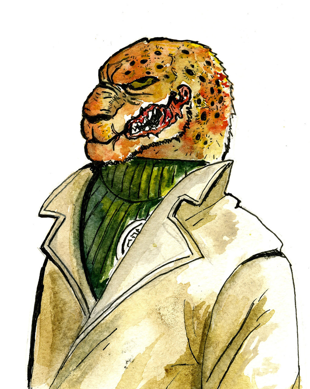 Description: A drawing of a man in a white coat and green scarf with a leopard head on his head and a green scarf around his neck.