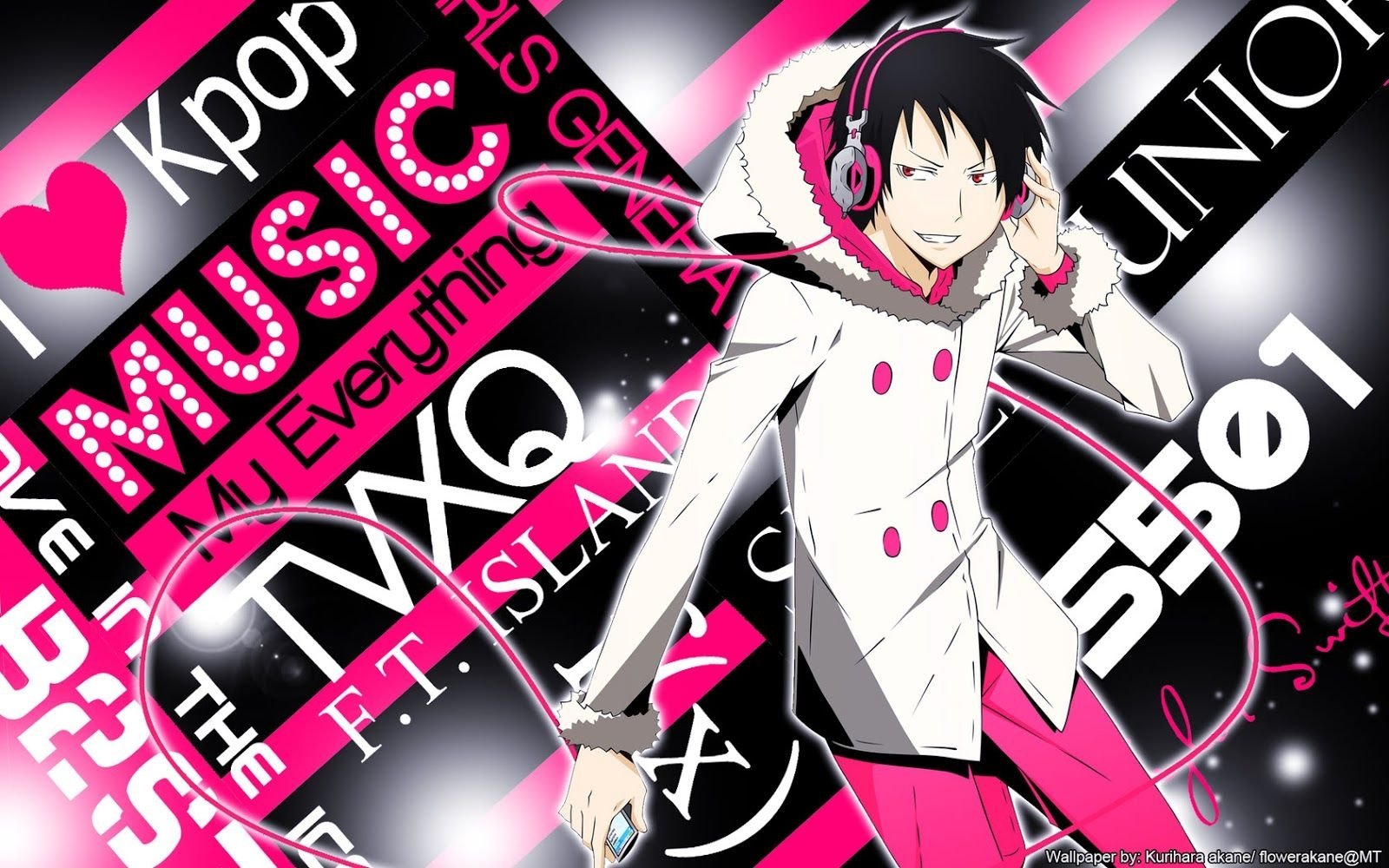 Description: A man in a white coat and headphones with pink hair and headphones on his ears and a pink and black background.