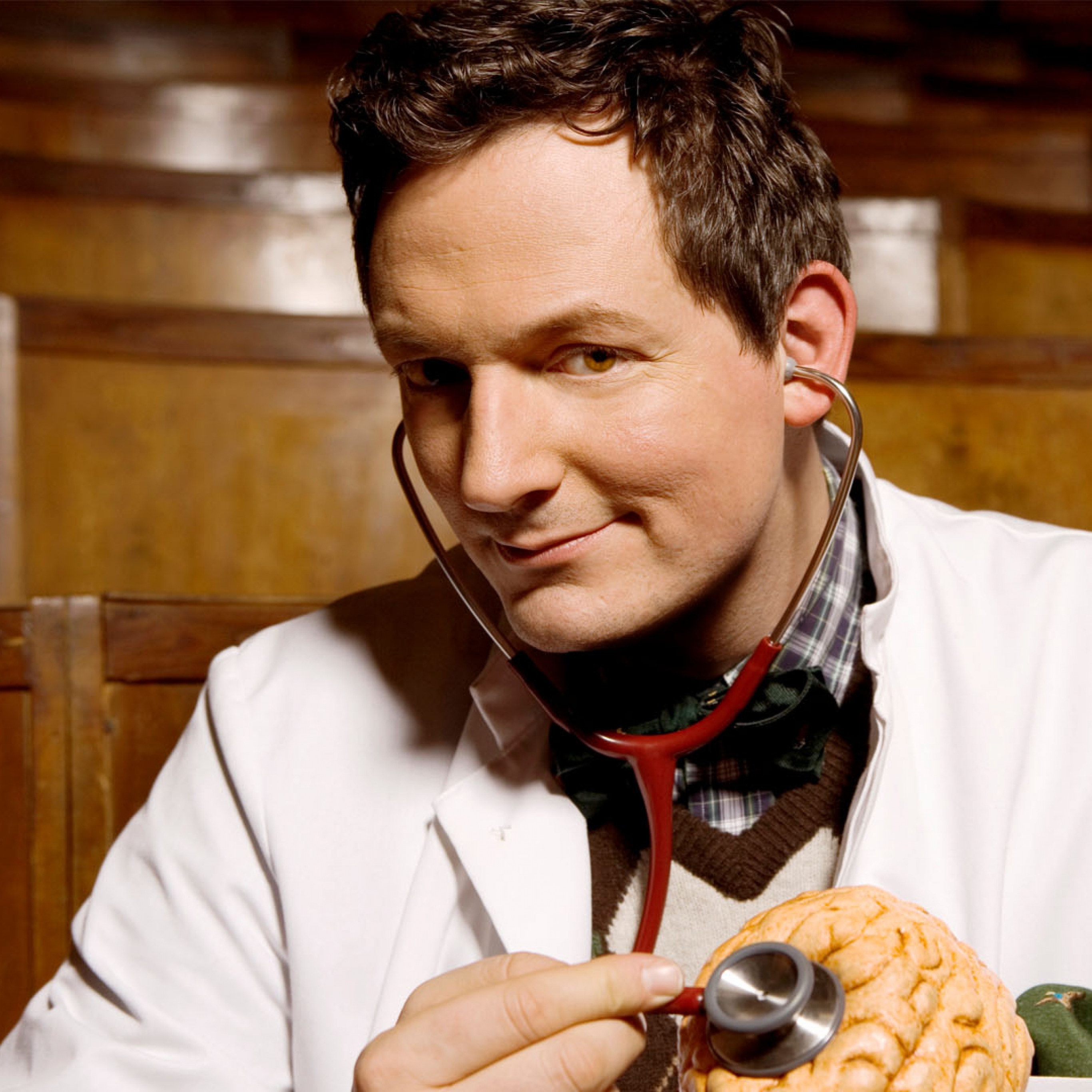 Description: A man in a white coat holding a stethoscope and a brain model in his hand in a room.