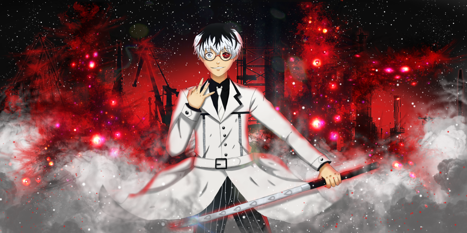 Description: A man in a white coat holding a sword in his hands and a red background behind him with red and white lights.