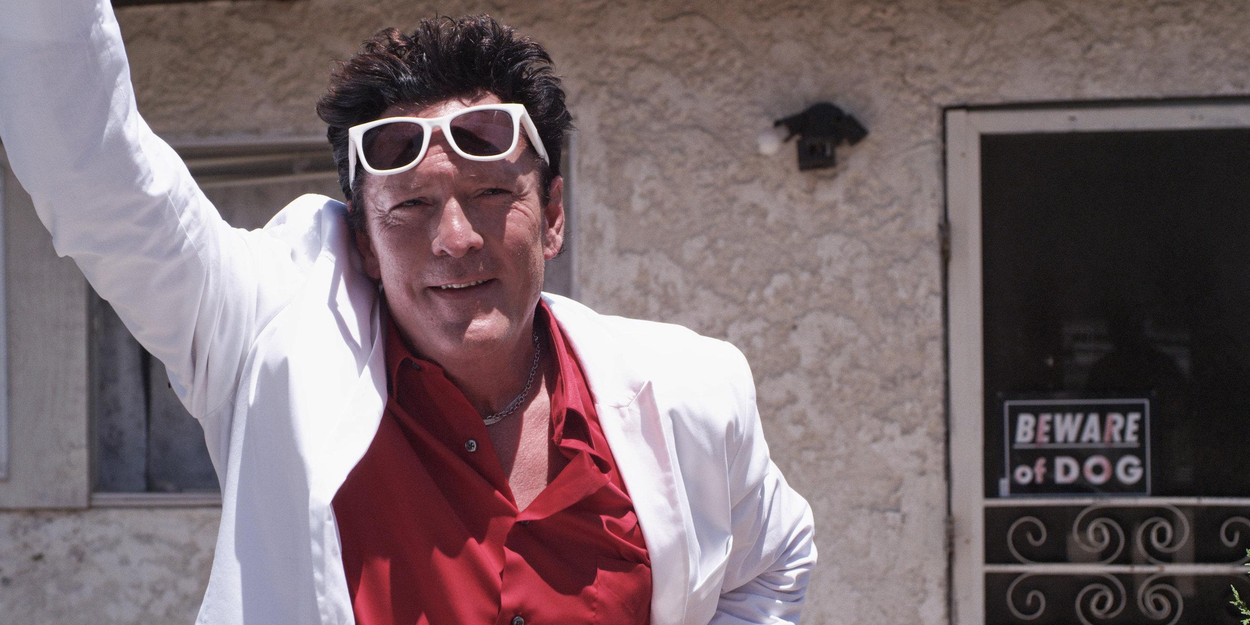Description: A man in a white jacket and sunglasses waving to the camera with his hand up in the air and his right hand up in the air.