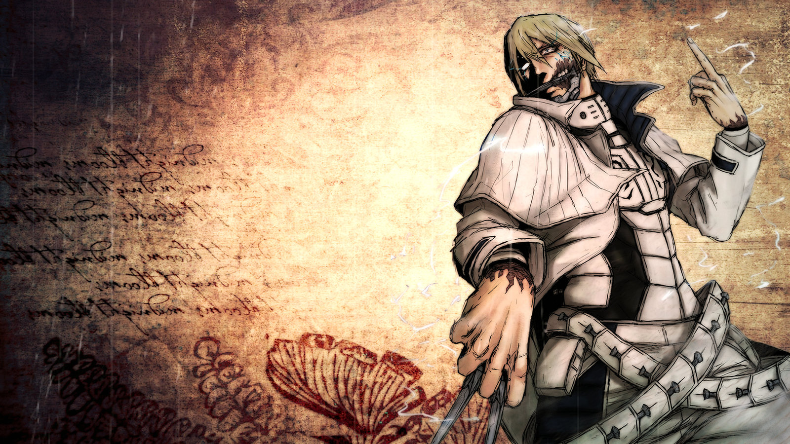 Description: A man in a white outfit holding a knife and a cigarette in his hand and a wall with writing on it.