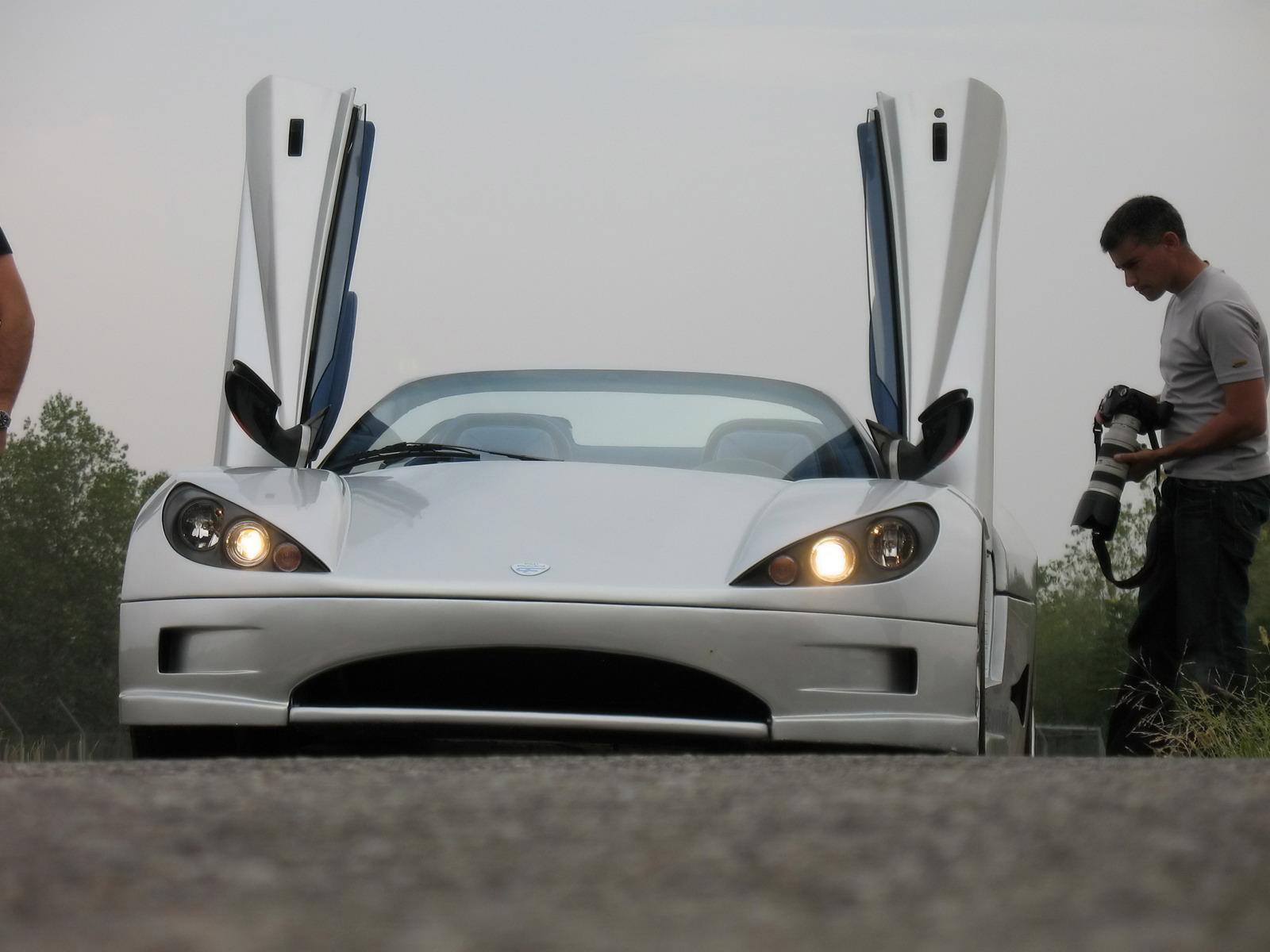 Description: A man standing next to a white sports car with its doors open and a man standing next to it.