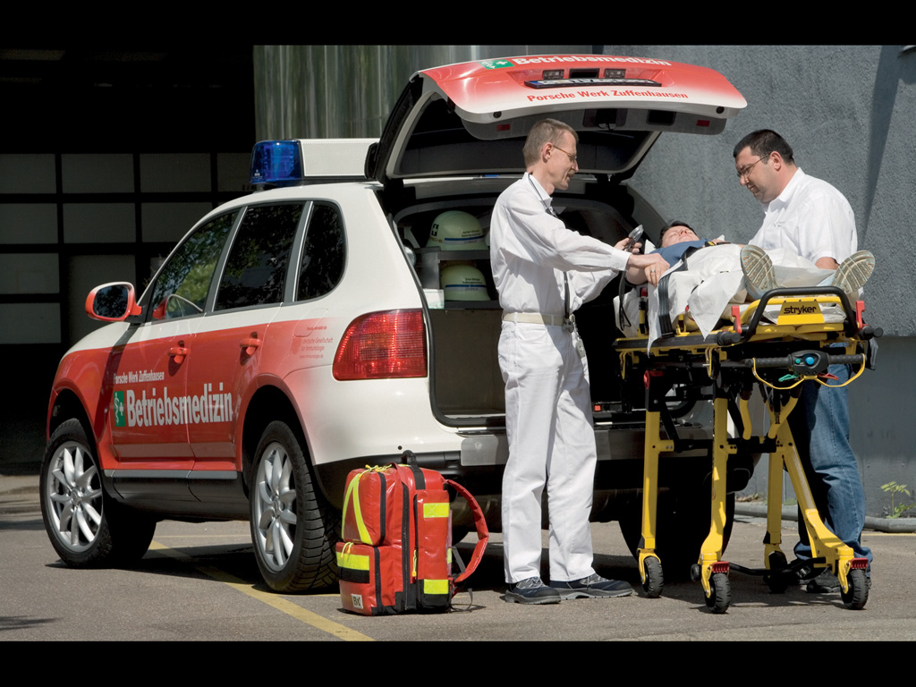 Description: A man in a white suit is being loaded into a car by a man in a white suit and a red and yellow car.