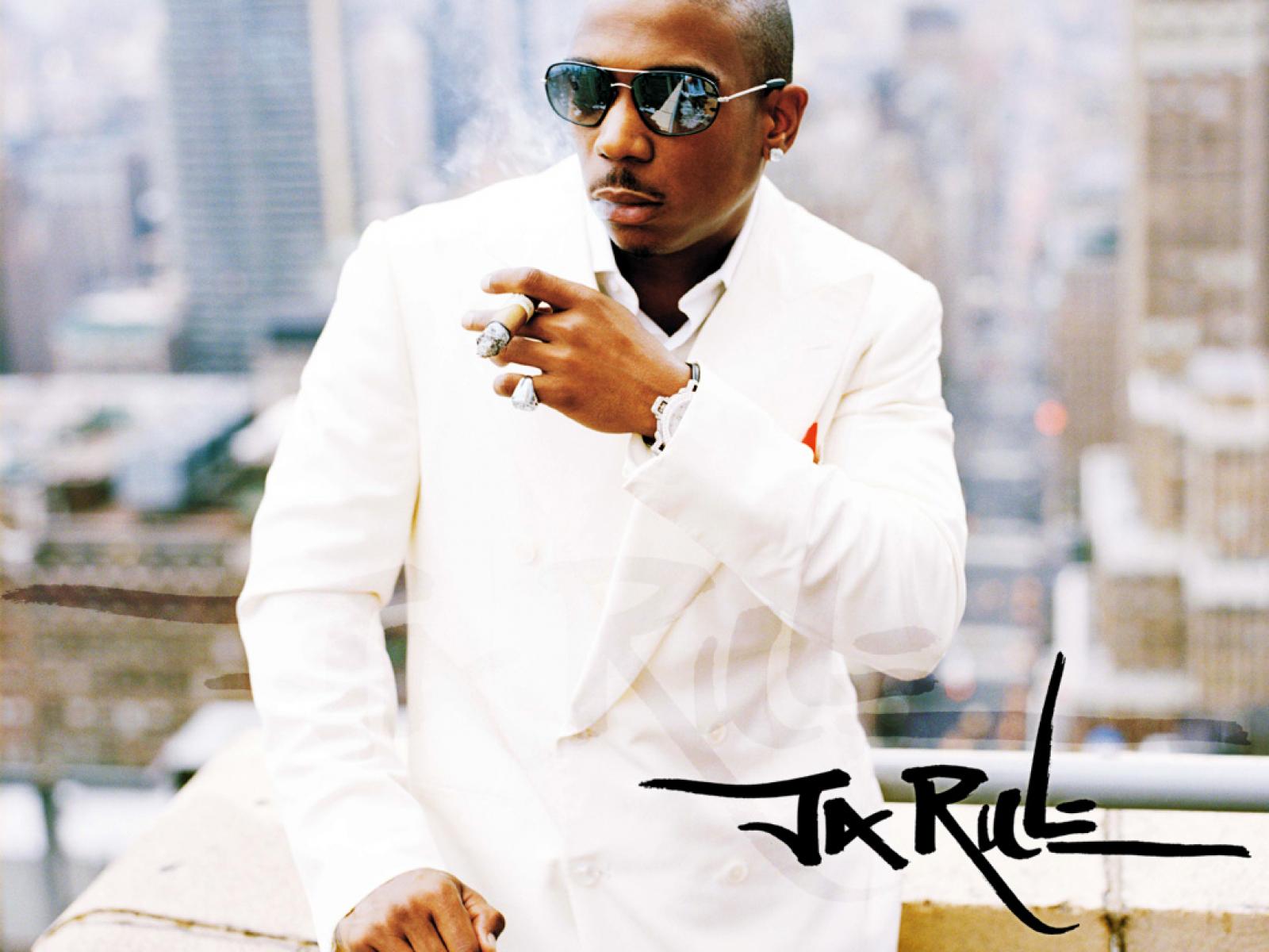 Description: A man in a white suit smoking a cigarette in a cityscape area with a skyline in the background.