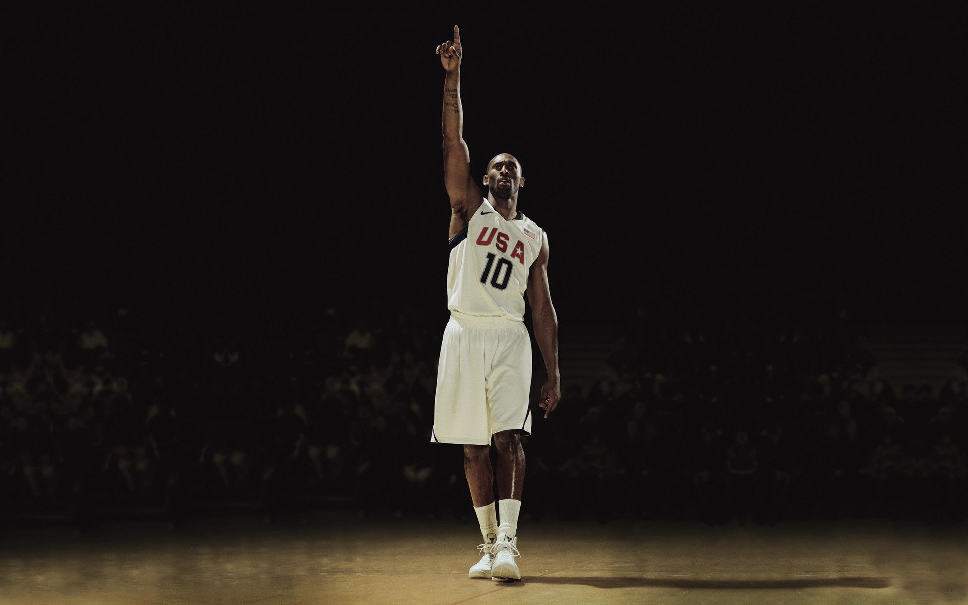Description: A man in a white uniform is playing basketball in a dark room with a crowd of people watching him.