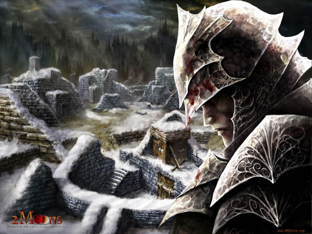 Description: A man in a white coat and a black helmet with a bloody face and a snowy landscape behind him.