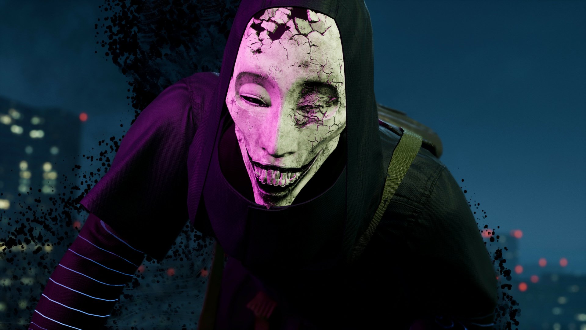 Description: A man with a white mask and purple paint on his face and a black hoodie on his head.