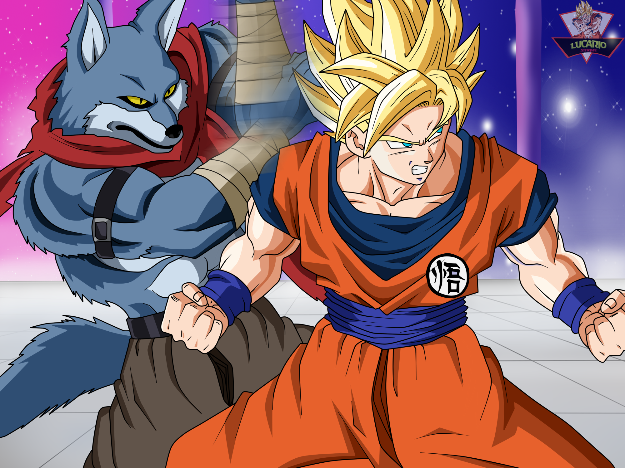 Description: A cartoon of a man and a wolf fighting in a room with a purple background and a pink sky.