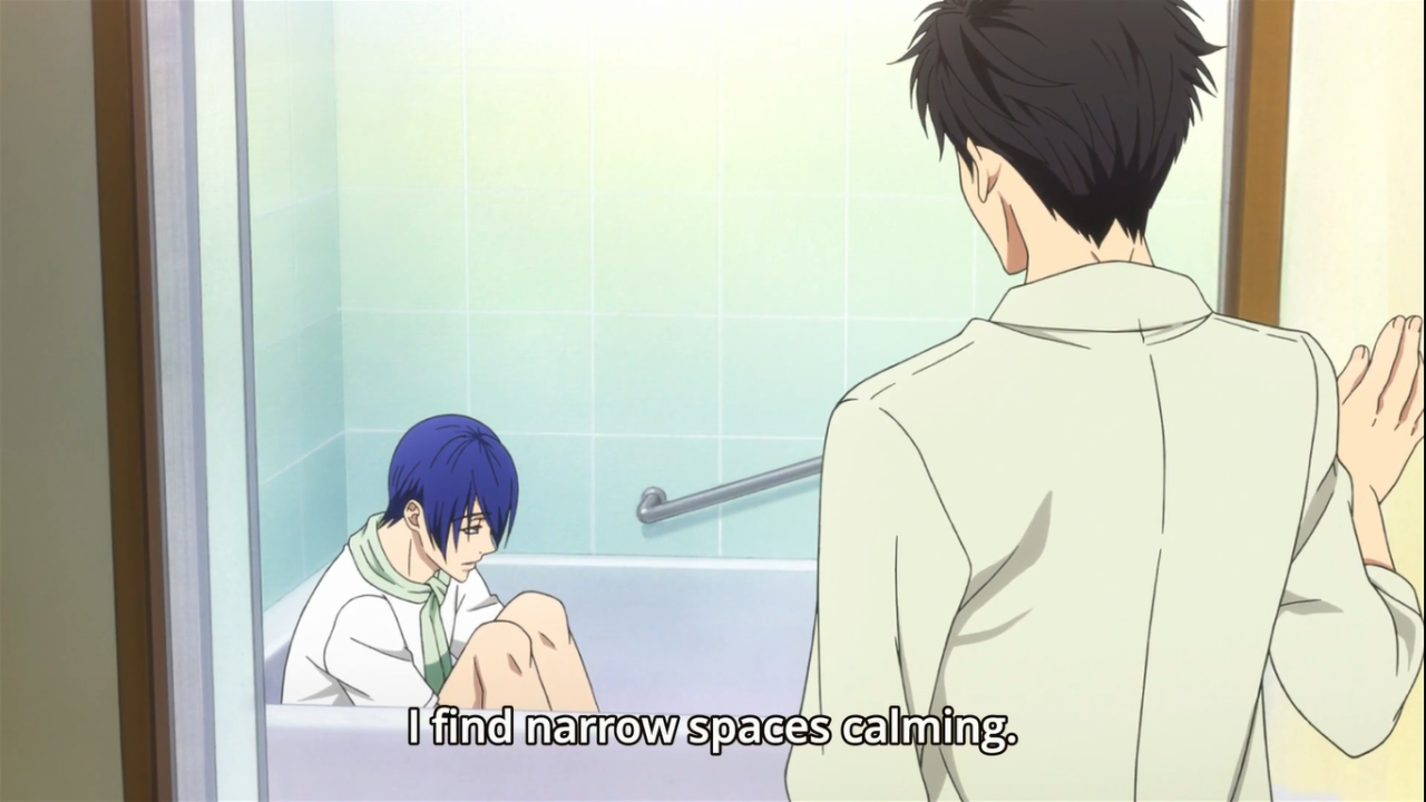 Description: A man and a woman in a bathroom with a shower door open and a text that reads.