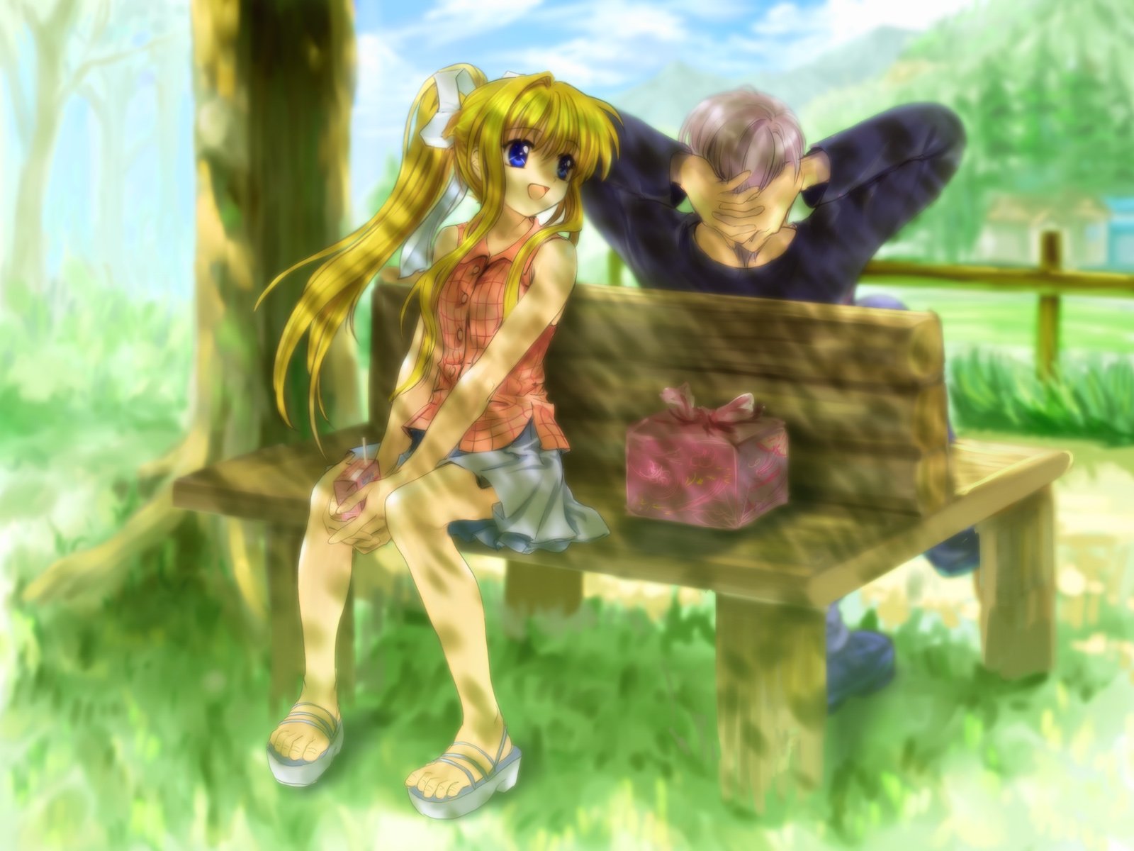 Description: A man and a woman sitting on a bench in the grass with a box of presents in front of them.