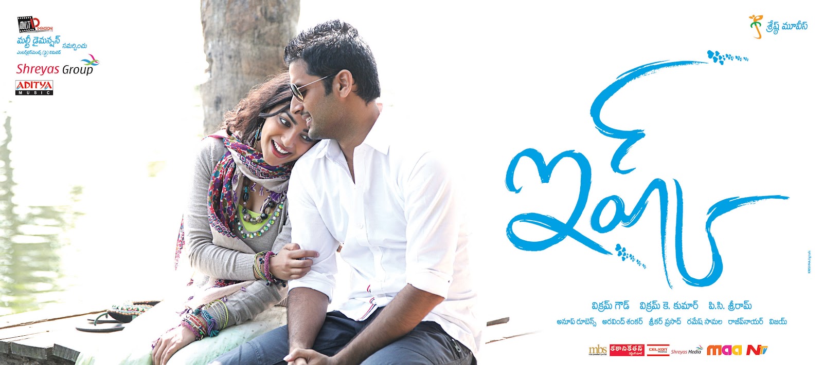 Description: A man and woman sitting on a bench in front of a poster for a movie with the words'saala '.
