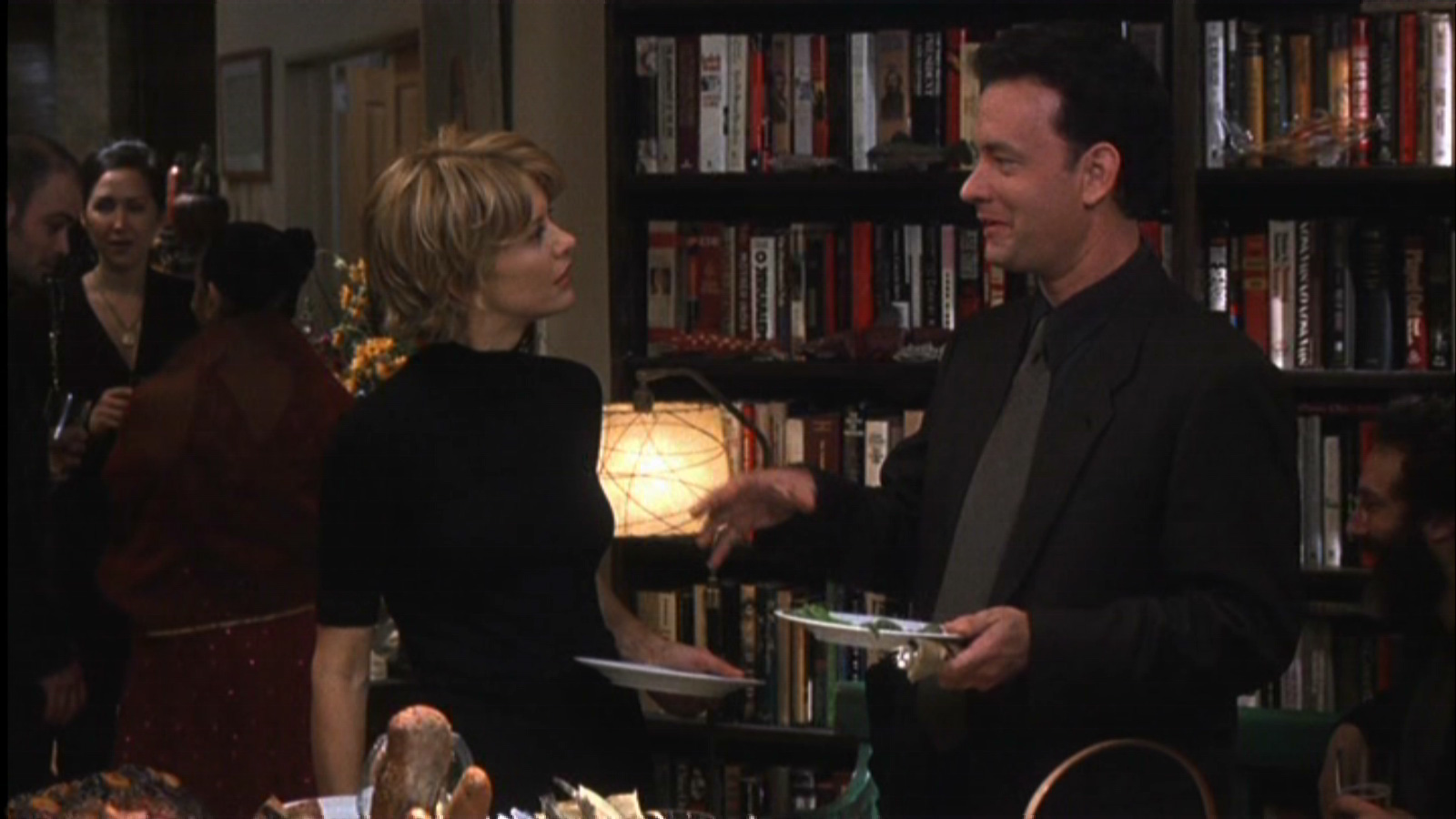Description: A man and woman standing in front of a book shelf with a plate of food on it and a man holding a plate.