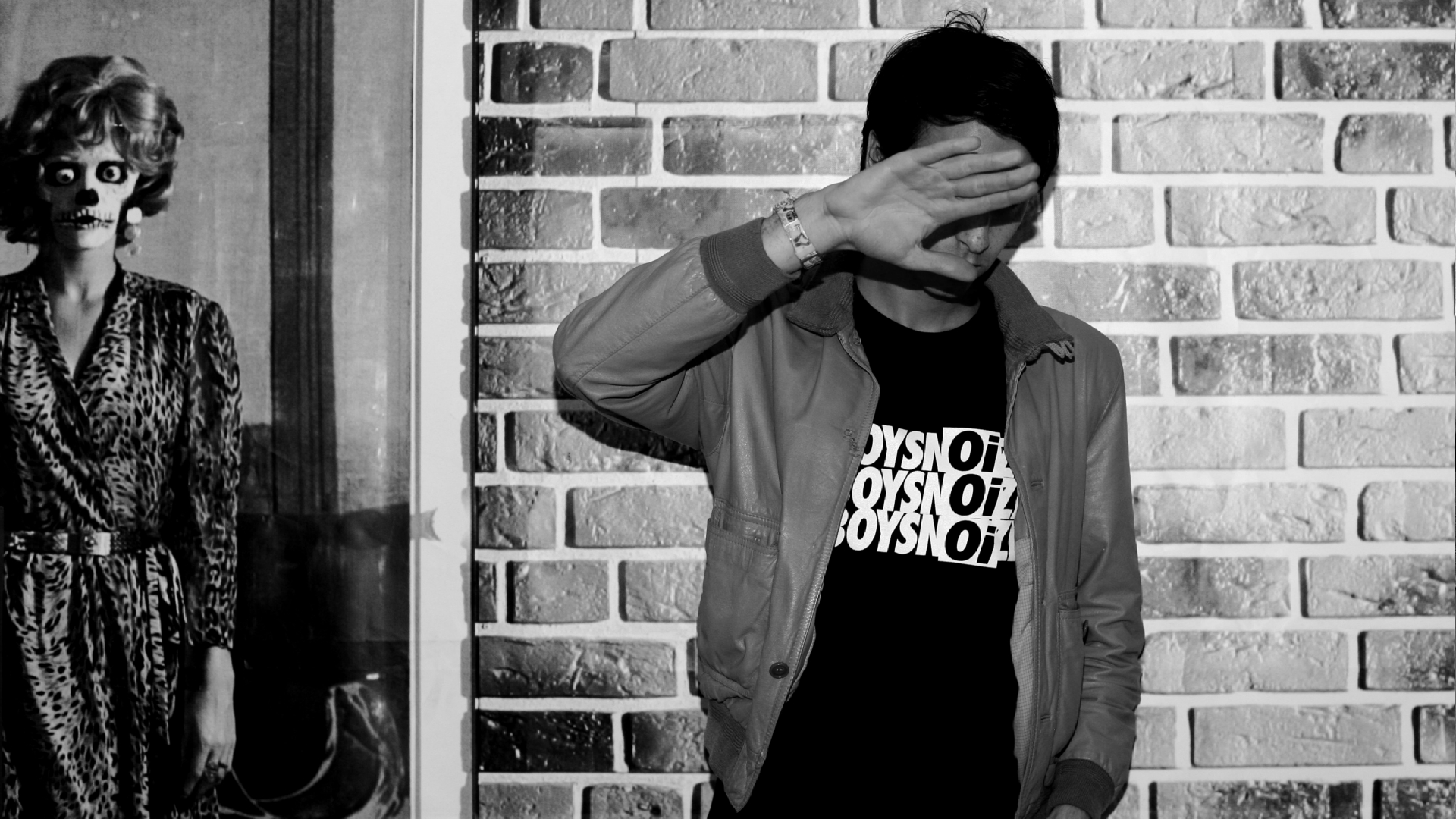 Description: A man standing next to a woman in front of a brick wall with a hand covering his face with a hand.