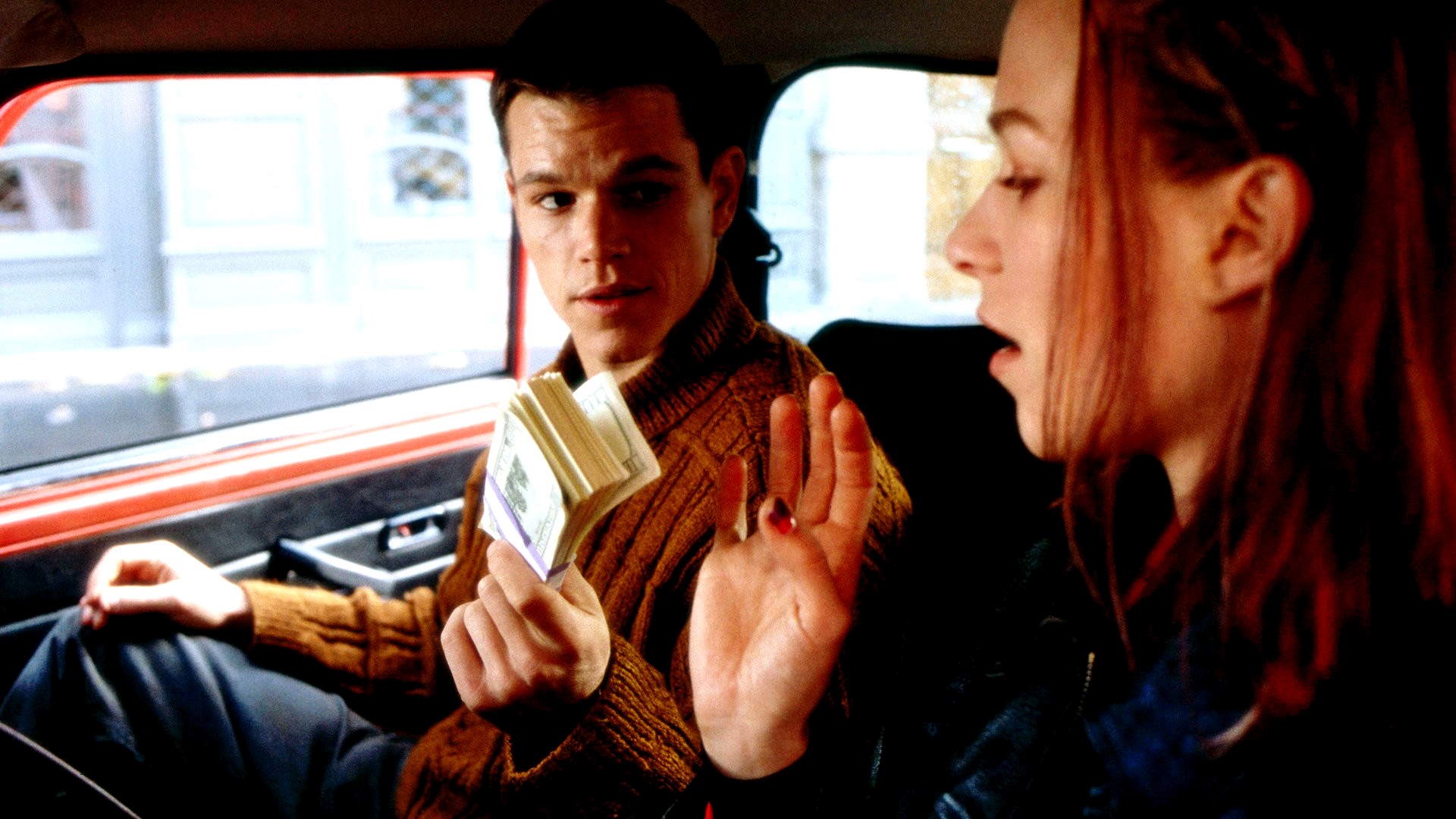 Description: A man and a woman sitting in a car and one is holding money in her hand and the other is holding a cell phone.