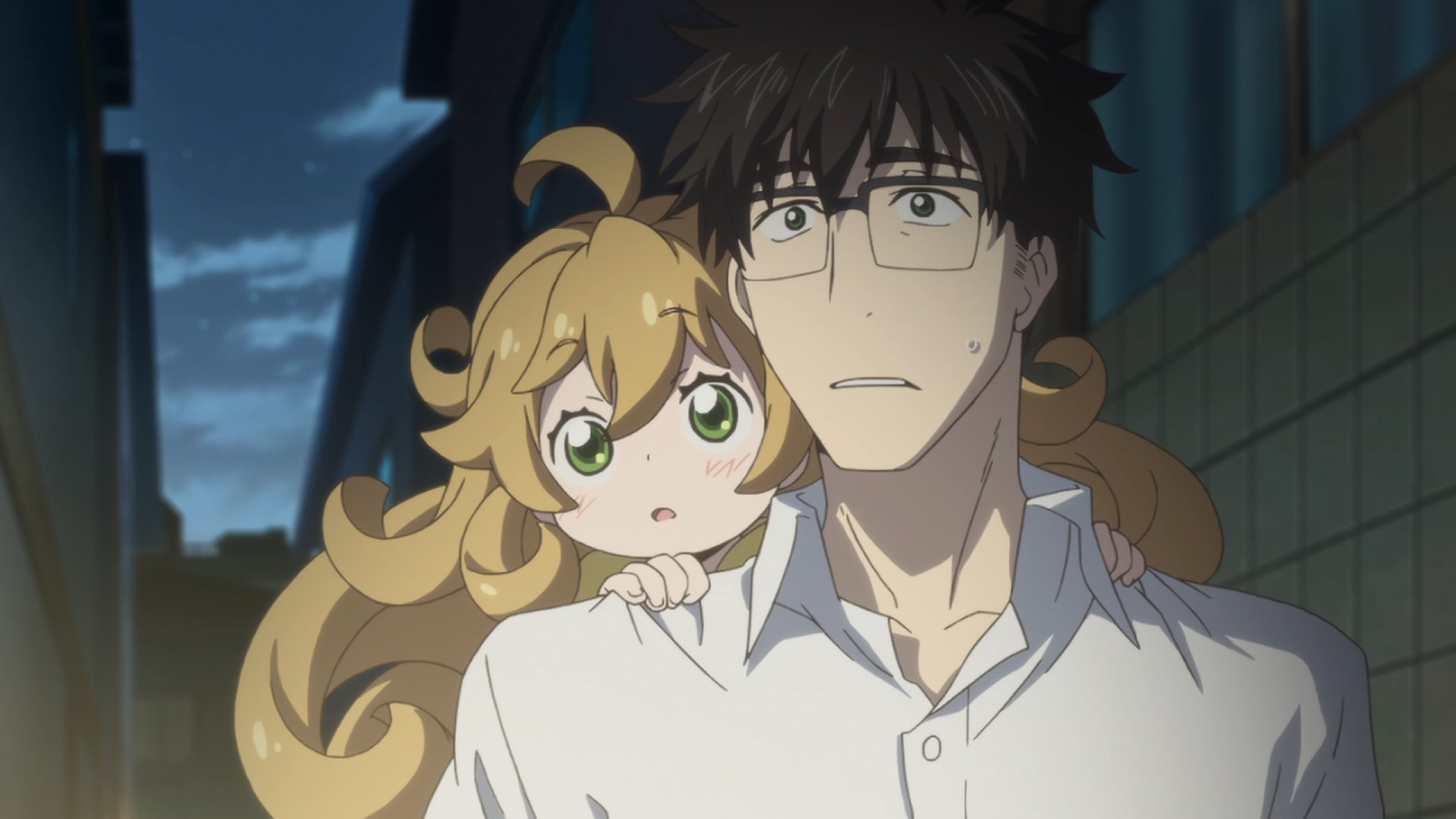 Description: A man and a woman standing next to each other in a city at night with a building in the background.