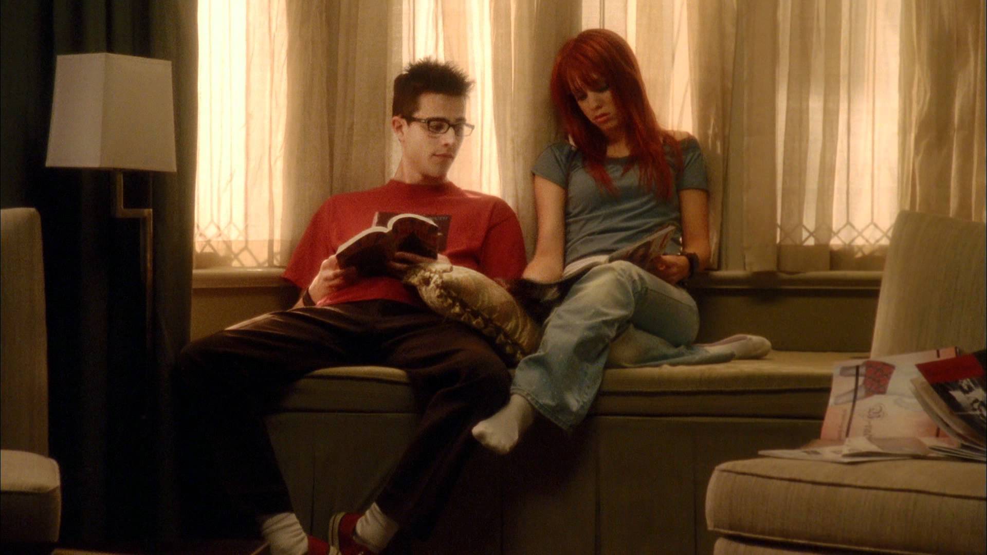 Description: A man and a woman sitting on a couch looking at a cell phone together in a living room with curtains.