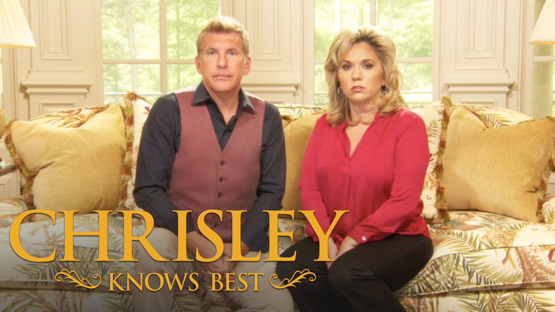 Description: A man and woman sitting on a couch in front of a window with the words chelsea knows best written on it.