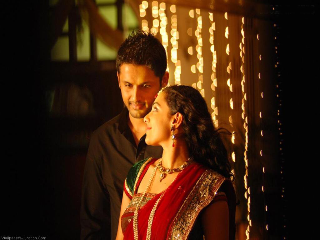 Description: A man and woman standing next to each other in a dark room with lights on the walls and a curtain behind them.
