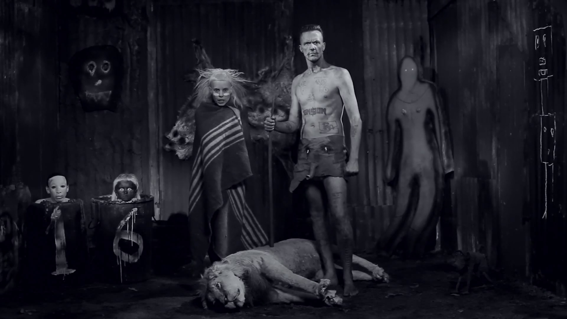 Description: A man and a woman standing next to a dead animal in a room with other dolls and a table.