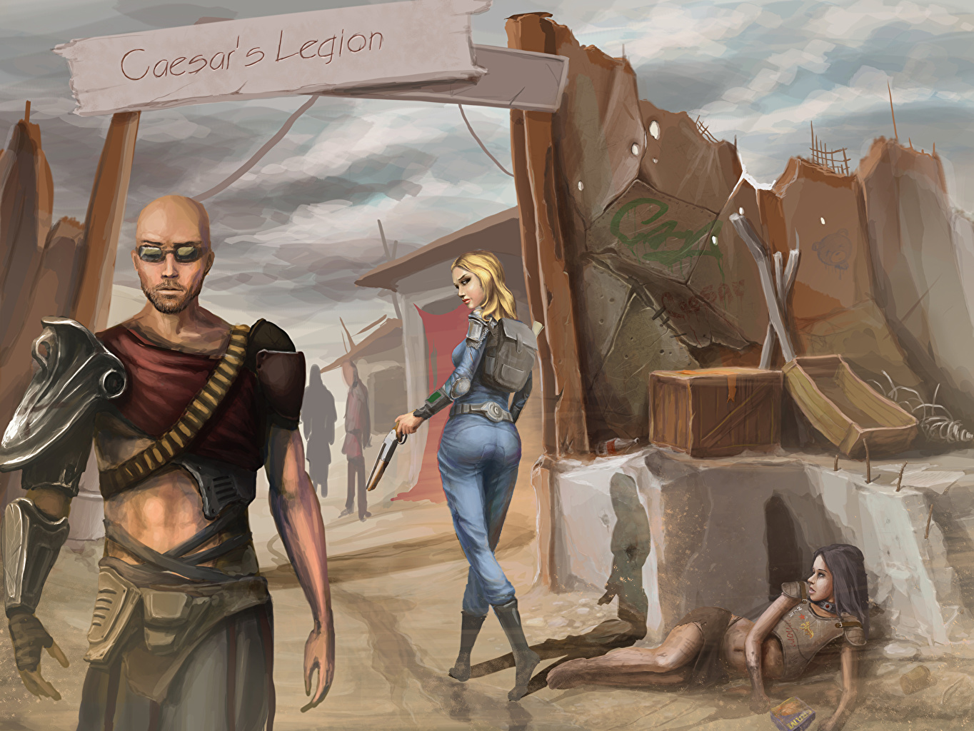 Description: A man and a woman walking through a desert area with a sign that says coecacy's location.
