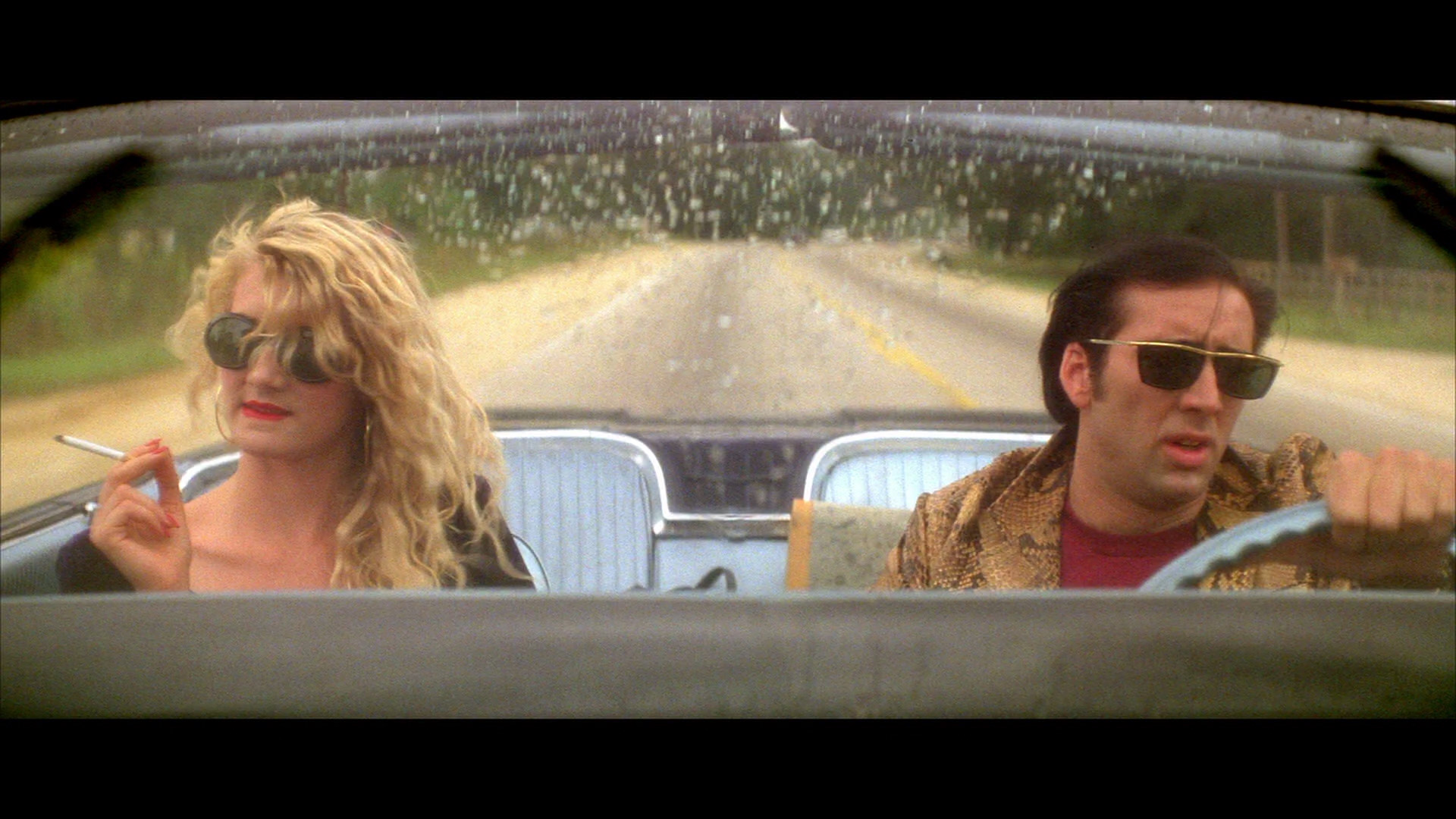 Description: A man and a woman driving a car in the rain with sunglasses on and a cigarette in their mouth.