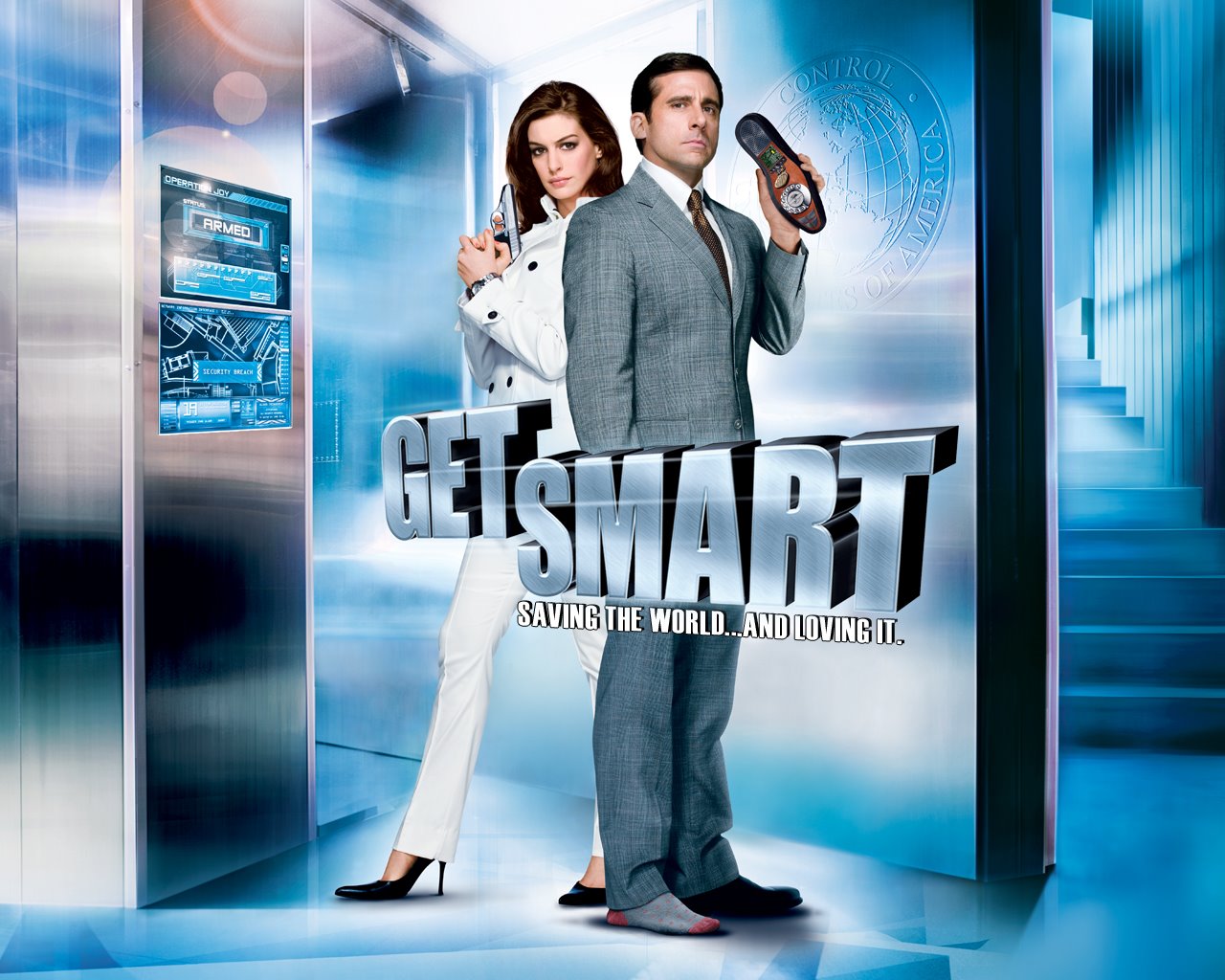 Description: A man and woman standing in front of a elevator with a cell phone in their hand and a man in a suit and tie.