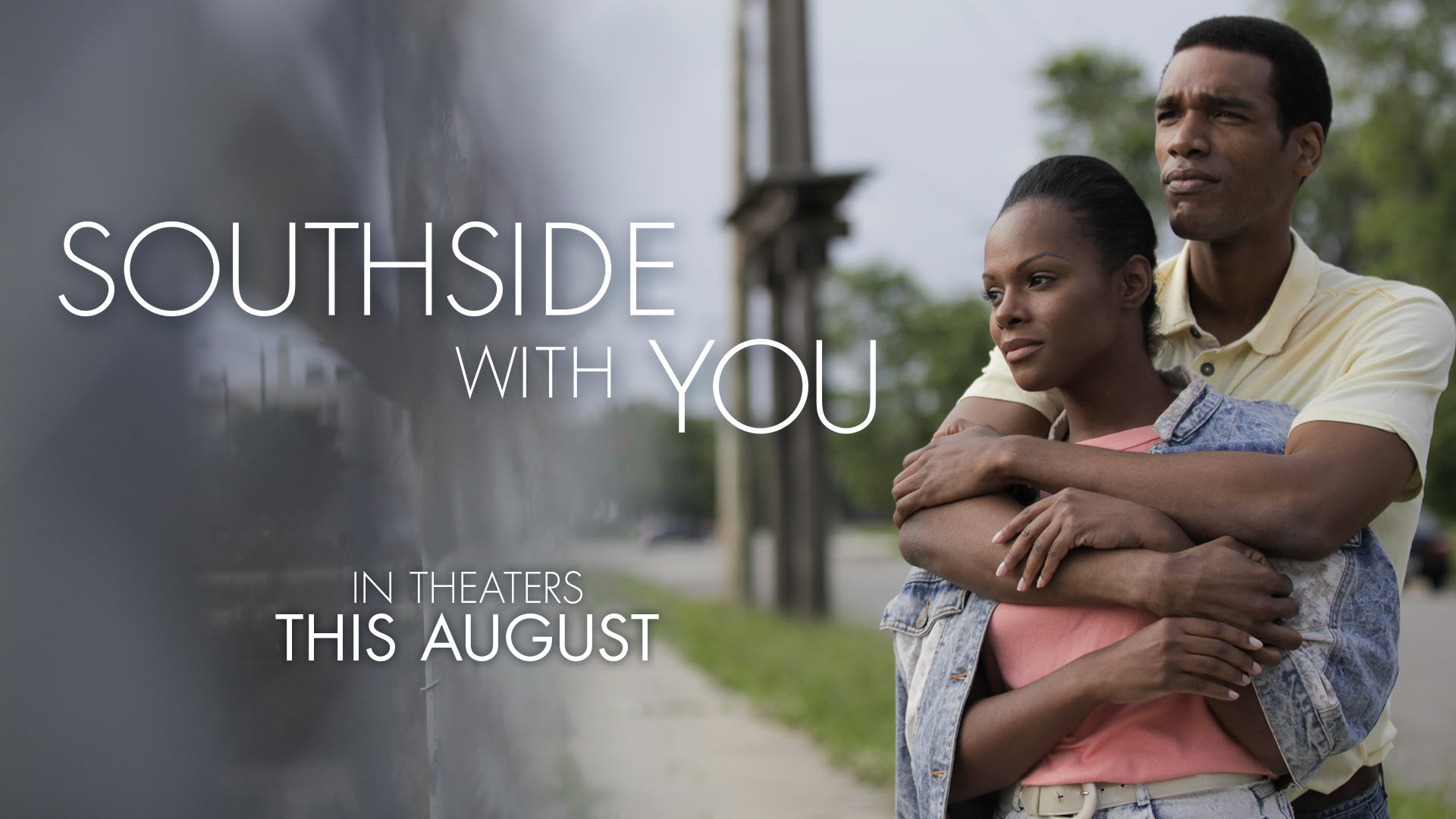 Description: A man and woman embracing each other in front of a wall with the words.