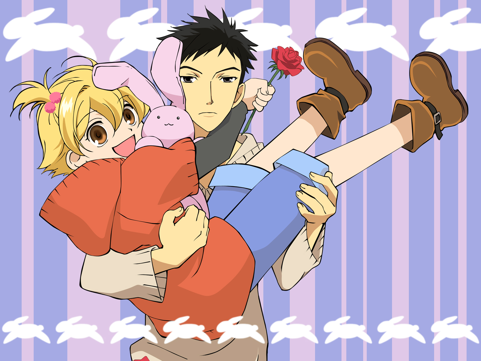 Description: A man holding a woman in his arms and a flower in his hand.