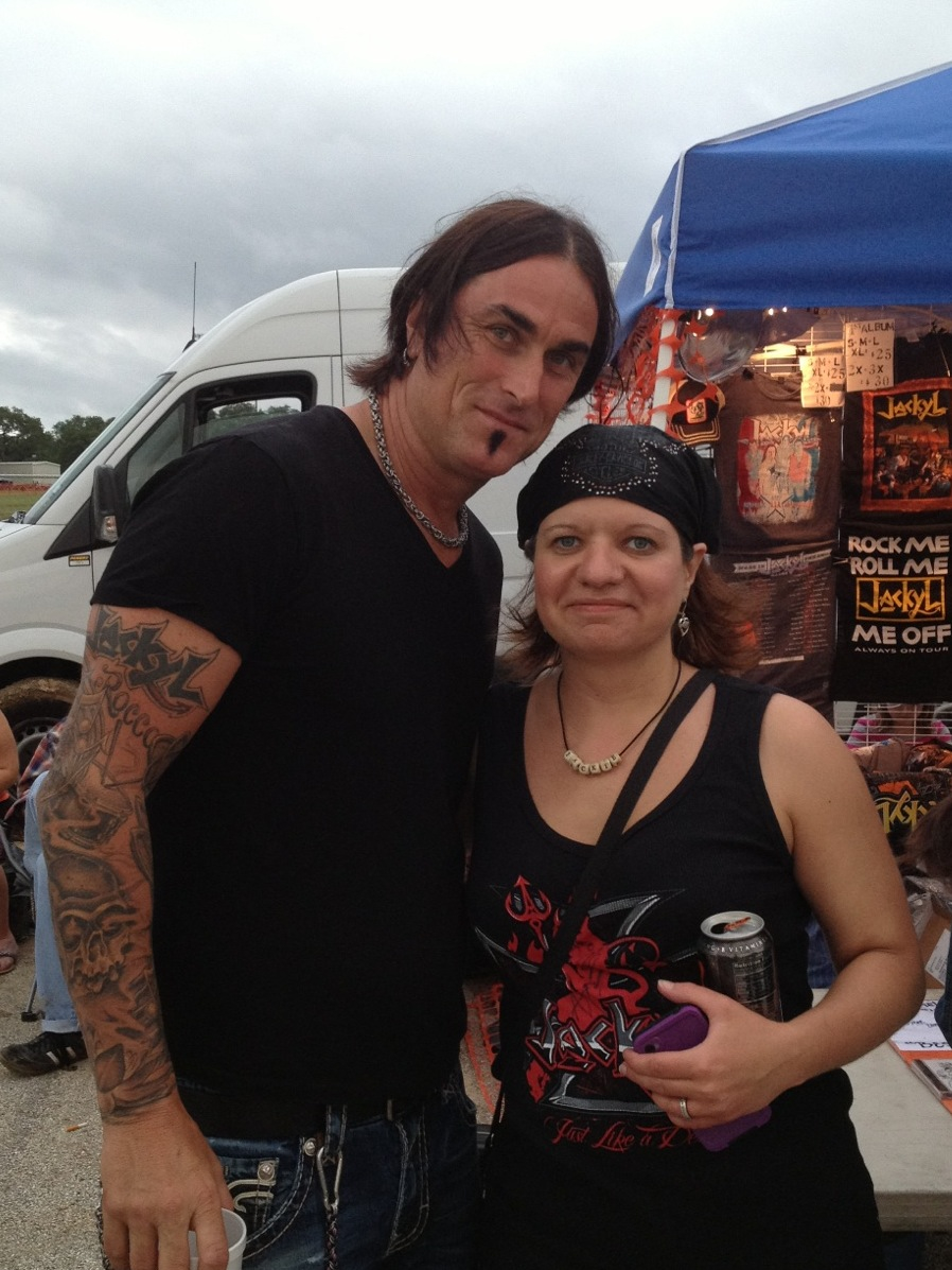 Description: A man and a woman standing next to each other at a food stand with a blue tent in the background.